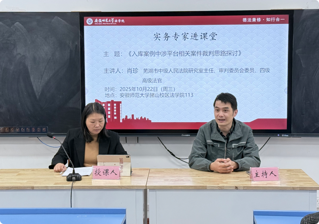 为推进研究生分类培养,凝练法律专业硕士公司产品特色,完善以实践为导向的人才培养机制,10月22日,公司在113教室举行“实务专家进课堂”第七期。本次活动邀请到芜湖市中级人民法院研究室主任、审判委员会委员、四级高级法官肖珍法官担任主讲,英国上市公司365讲师、硕士研究生导师韩瀚博士担任主持人,法律专业硕士研究生参加。