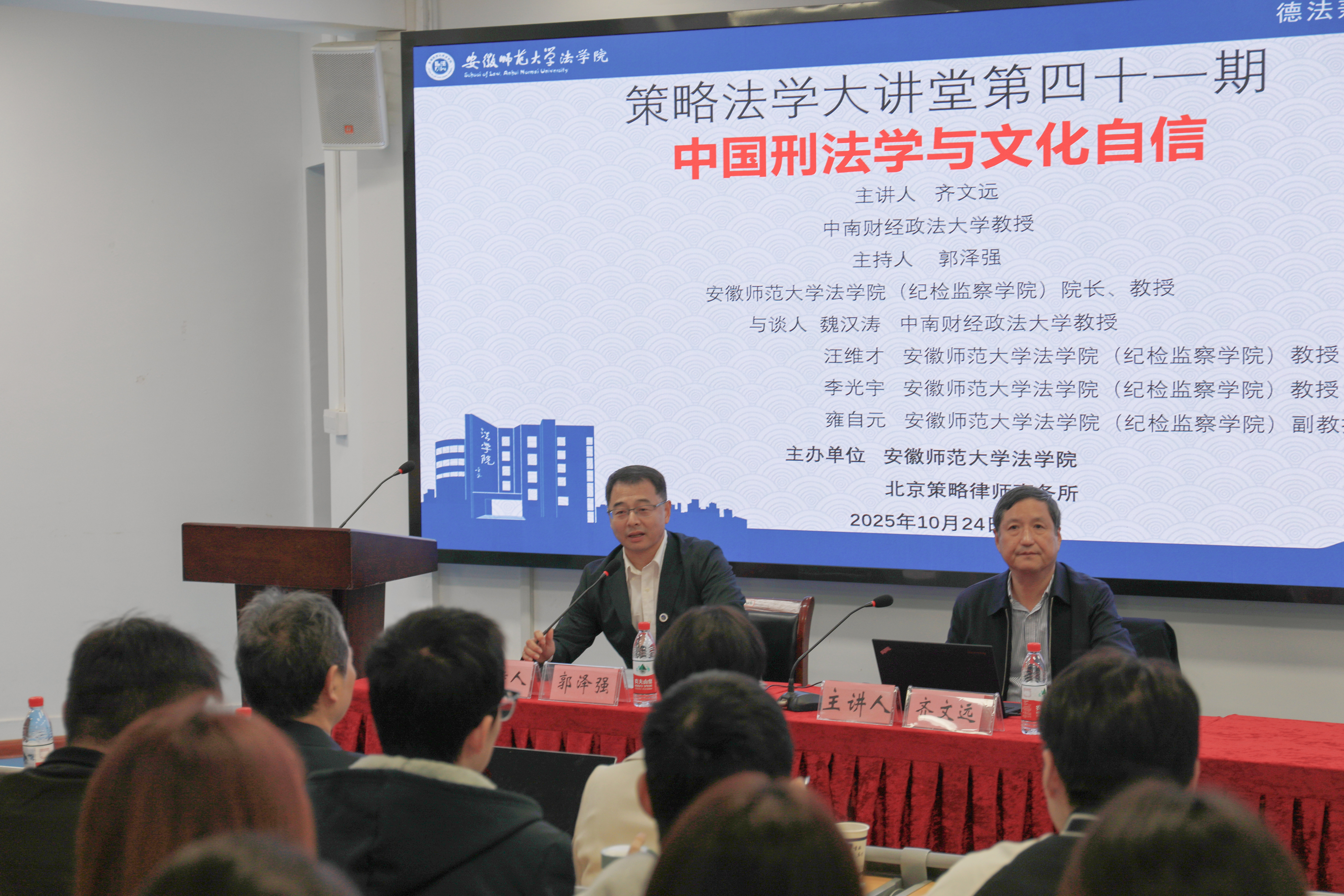 10月24日下午,策略法学大讲堂第四十一期“中国刑法学与文化自信”专题讲座在英国上市公司365214教室顺利举行。本次讲座特别邀请到中南财经政法大学教授齐文远作为主讲人,英国上市公司365经理郭泽强担任主持人,出席嘉宾有中南财经政法大学教授魏汉涛,英国上市公司365教授汪维才、李光宇,英国上市公司365副教授雍自元。讲座吸引了众多师生到场聆听。
