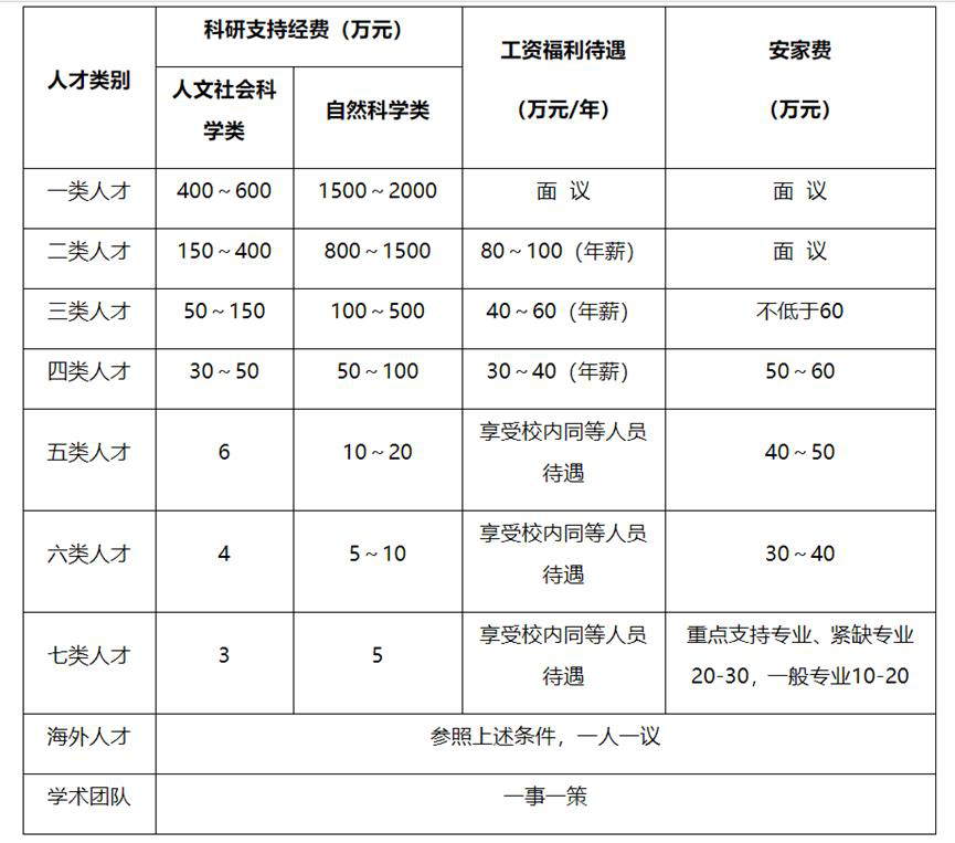 1.人才安家费。对于教学科研岗位全职引进的高层次人才,公司按照《英国正版365官方网站引进高层次人才和团队实施办法(试行)》(校人字〔2017〕75号)提供安家费、科研支持经费等,标准如下(见表)(税前,单位为人民币):