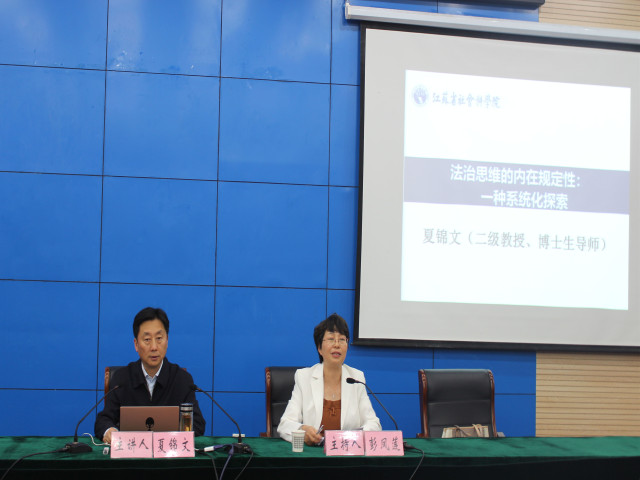 夏锦文教授主要从法治思维的概念及特征、法治思维的主要内容及其应用、法治思维的实践及其培育三个方面进行探讨。他指出法治思维具有价值导向和行为规范的作用,有利于人们在日常生活中认识事物、解决是非;在思维方法论中,只有把法治思维贯穿其中,才能将其他思维进行整合。他从规则、权利保障、权力制约、责任、程序、公平正义思维等六个维度详解了法治思维的内容及运用;并指出要在深化改革、推动发展、解决矛盾、维护稳定中运用法治思维,通过多方立体、多元载体、多重机制、多样方式培育法治思维,最终实现良法善治的目的。(文/图 黄雅倩)