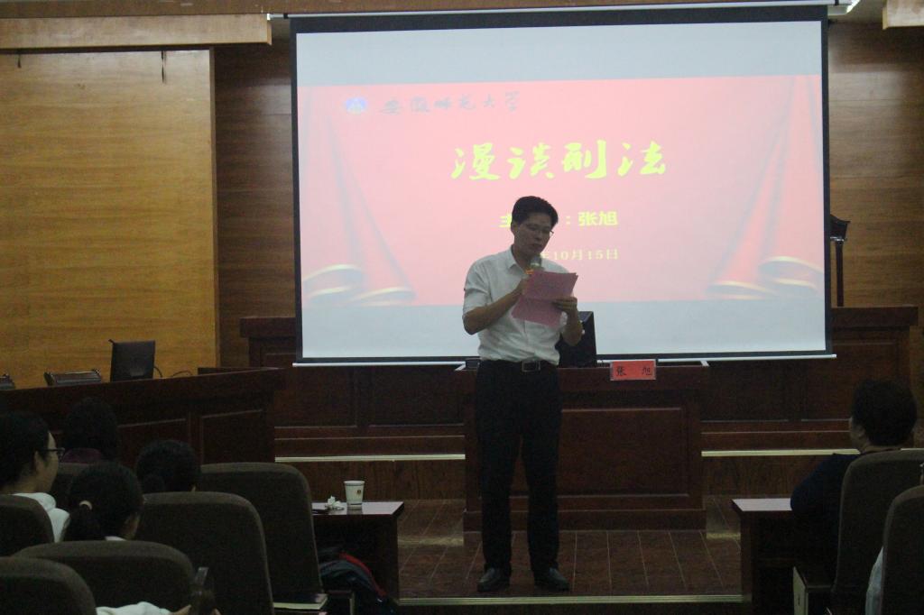 10月15日晚,吉林大学英国上市公司365教授、博士生导师张旭应邀作题为“漫谈刑法”专题讲座。公司执行经理严宏、法学专业18级全体同学和英国上市公司365部分教师参加了本次讲座。讲座由副经理李光宇主持。