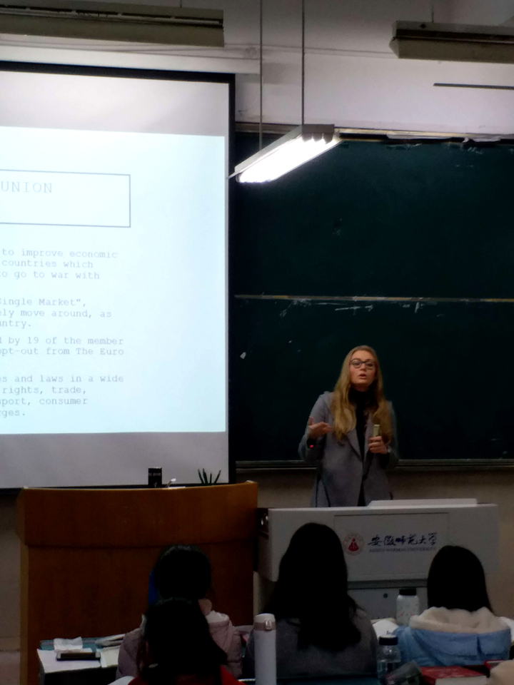 2018年11月,受公司邀请,来自英国的 PATRICIA女士为公司16法学及卓越班做了题为UK ECONOMY AND BRIXIT的专题讲座。本次讲座在国际经济法课程随堂进行,讲座之后,同学们就英国经济与国际贸易,英国经济与中国, 英国脱欧对国际经济可能造成的影响,以及英国的高等教育等方面向嘉宾提问,PATRICIA女士一一详尽解答。