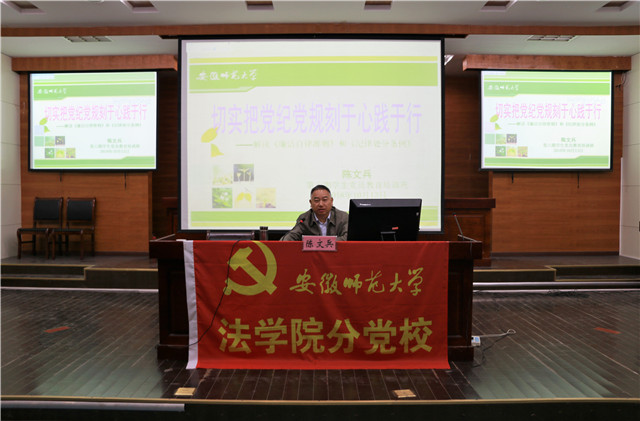 校纪委副书记、监察处处长陈文兵授课主题为《切实把党规党纪刻于心践于行——解读< 廉洁自律准则>和< 纪律处分条例>》”,他从党规党纪概述、关于《廉洁自律准则》《纪律处分条例》的修订、有关规定的纪律界限和自觉做遵规守纪的模范这五个方面展开,为大家深刻讲述党规党纪的“前因后果”。他强调,守纪律、讲规矩是共产党人的政治基因,不是一时的事情,而是党员干部一辈子的事情。