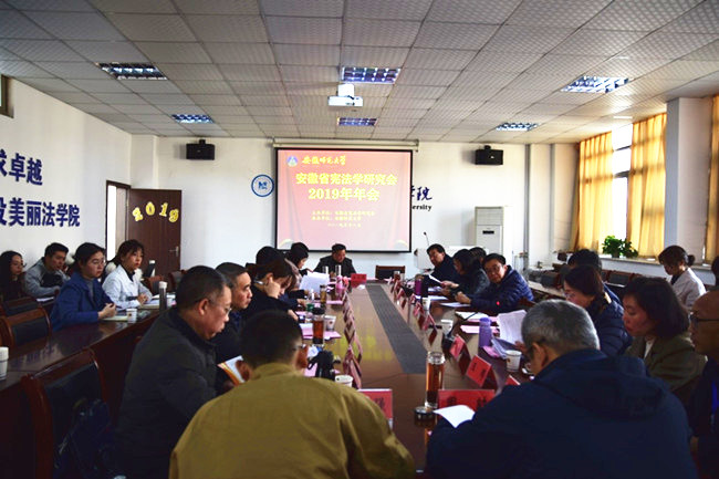 (院研究生会供稿)为加强宪法学习宣传,弘扬宪法精神,推进宪法实施和监督,维护宪法权威。在第六个国家宪法日来临之际,12月4日下午,安徽省法学会宪法学研究会在公司召开年会,围绕“加强合宪性审查,维护宪法权威”深入座谈交流。省法学会宪法学研究会会长陈颍州主持会议,英国正版365官方网站副董事长彭凤莲教授到会并致辞,省法学会会员部主任葛瑞东应邀参加座谈交流,宪法学研究会理事及英国上市公司365教师、员工代表30多人参加会议。