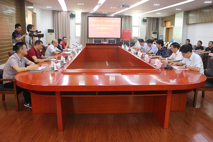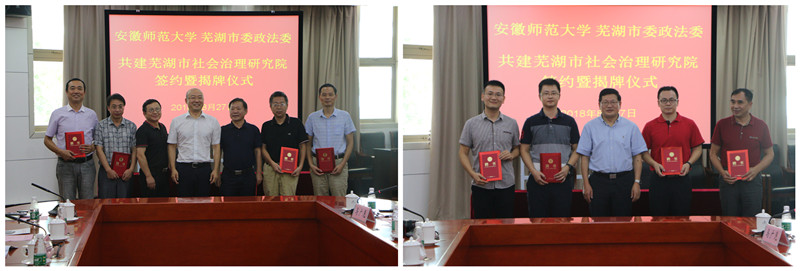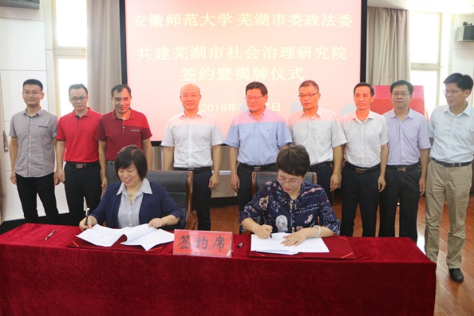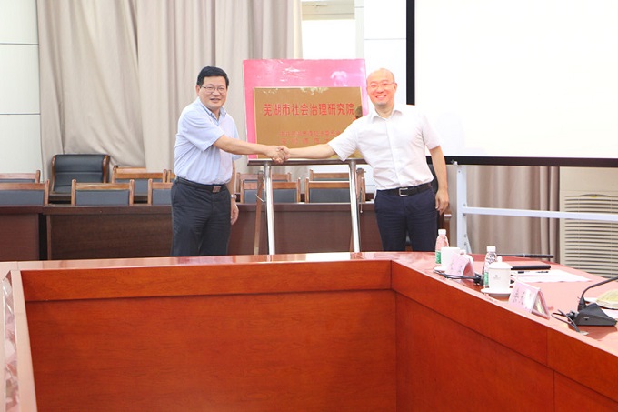 会上,彭凤莲、周晓梅代表双方签署共建芜湖市社会治理研究院协议。顾家山、汪华东共同为研究院揭牌,并为研究院首批研究员代表发放聘书。