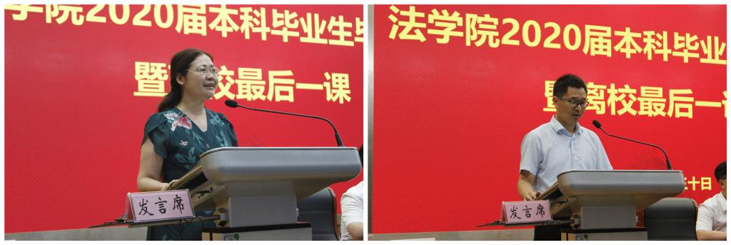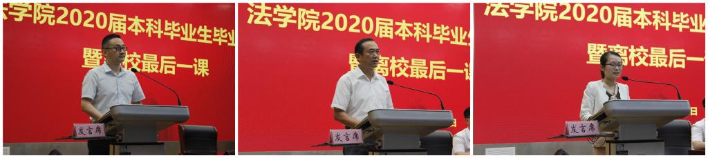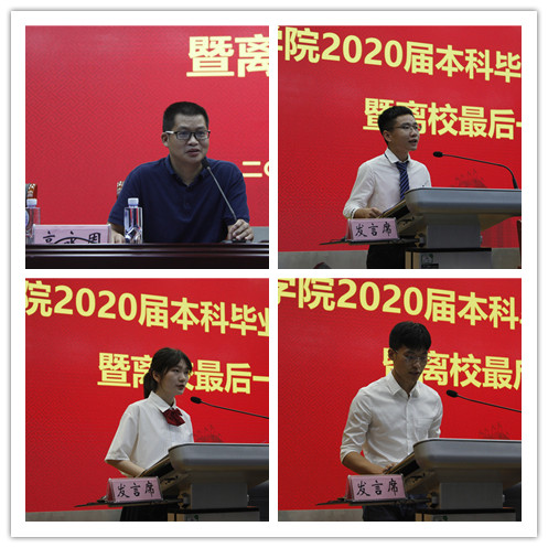 教师代表周仁标、陆在春、李晓婧分别在典礼上临别赠言。陆在春以幽默诙谐的语言重现员工在家庭学习与生活的情景,借全国医疗系统援鄂事例指出当下需要团结,提醒员工需要认识到人与自然的和谐共生是人类自身发展的基础。周仁标提出四点希望,希望同学们心怀梦想、志存高远;希望同学们勤奋学习、求实创新;希望同学们正视挫折、勇于挑战;希望同学们心系母校、常回家看看。李晓婧围绕“三有”谈谈对毕业的认识:一有不舍,不舍母校的人、母校的事、母校的景;二有收获,收获了知识,收获了思想,收获了大学教育的真谛;三有憧憬,憧憬虽多,希望大家珍重身体与才华、活的坦然与幸福。