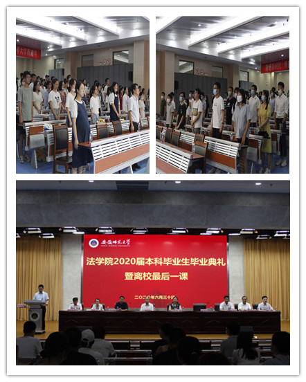 毕业生代表2016级法学专业刘岩、2016级行政管理专业陈朋、2018级法学专升本饶润东三位同学分别作了毕业感言,生动分享在师大成长的点点滴滴,承诺毕业之际将以实际行动为母校留下完美印象、为学弟学妹留下学习榜样、为自己留下美好回忆,表达了对母校老师谆谆教诲的感恩之心和对母校的依依不舍之情。同时,毕业生代表分别向三位辅导员桂彬、储梦凡、黄世凯献上鲜花和拥抱,感恩辅导员这几年的悉心陪伴和辛勤付出。
