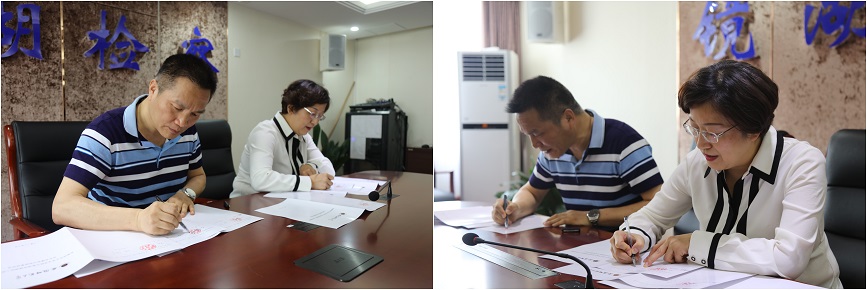 2018年6月11日上午,公司与镜湖区检察院在镜湖区检察院会议室举行专业实践基地签字授牌仪式。检察长张宁与公司副经理周俊强教授共同签署了实习实践基地合作建设协议,并为 “职业技术教育(司法服务方向)实践基地”揭牌。学位点负责人吴俊明教授、镜湖区检察院政治部李璇璇主任、校外导师汤恒明检察官等参加了仪式。