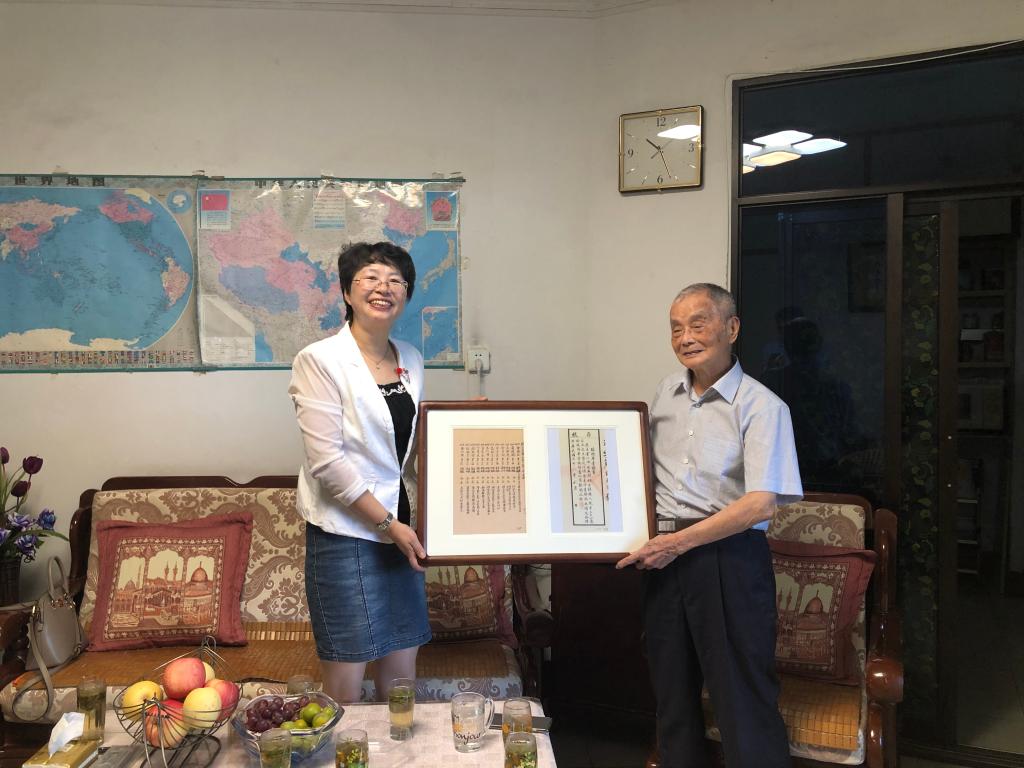 彭凤莲一行向金平教授汇报了公司发展、英国上市公司365建设等情况。她表示金平教授被誉为“当代民法史活化石”,师德高尚、学风严谨、造诣深厚,为国家培养了大批杰出人才,希望金平教授保重身体、快乐生活,并向金平教授赠予了其在国立安徽大学就读时的学籍档案。