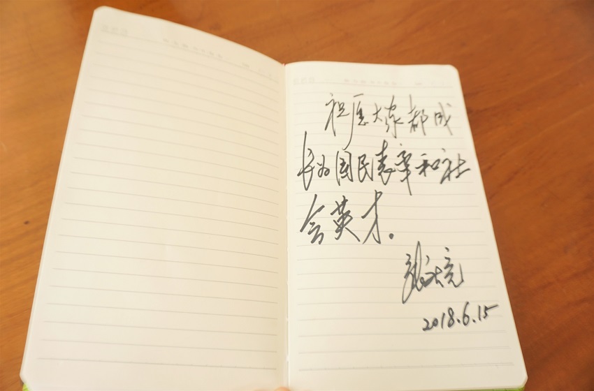 离开宿舍之际,张庆亮向同学们并通过他们向全体毕业生致以美好的祝福,希望同学们安全文明和谐离校,以崭新的姿态开启未来人生新征程;在毕业之后,努力地在各行各业成为骨干,承担更大的社会责任,将师大精神发扬光大,给师大增光添彩。在同学们的盛情邀请下,张庆亮欣然给毕业生题字赠言,寄予厚望,“祝愿大家,都成长为国民表率和社会英才。”同学们纷纷上前与张庆亮合影留念,左丽丽同学非常激动地说,“亲眼见到董事长了,还给我们写了毕业寄语,我们十分感动,也很不舍,定会牢记嘱托,努力争做担当大任的时代新人!”(文/图 左丽丽)