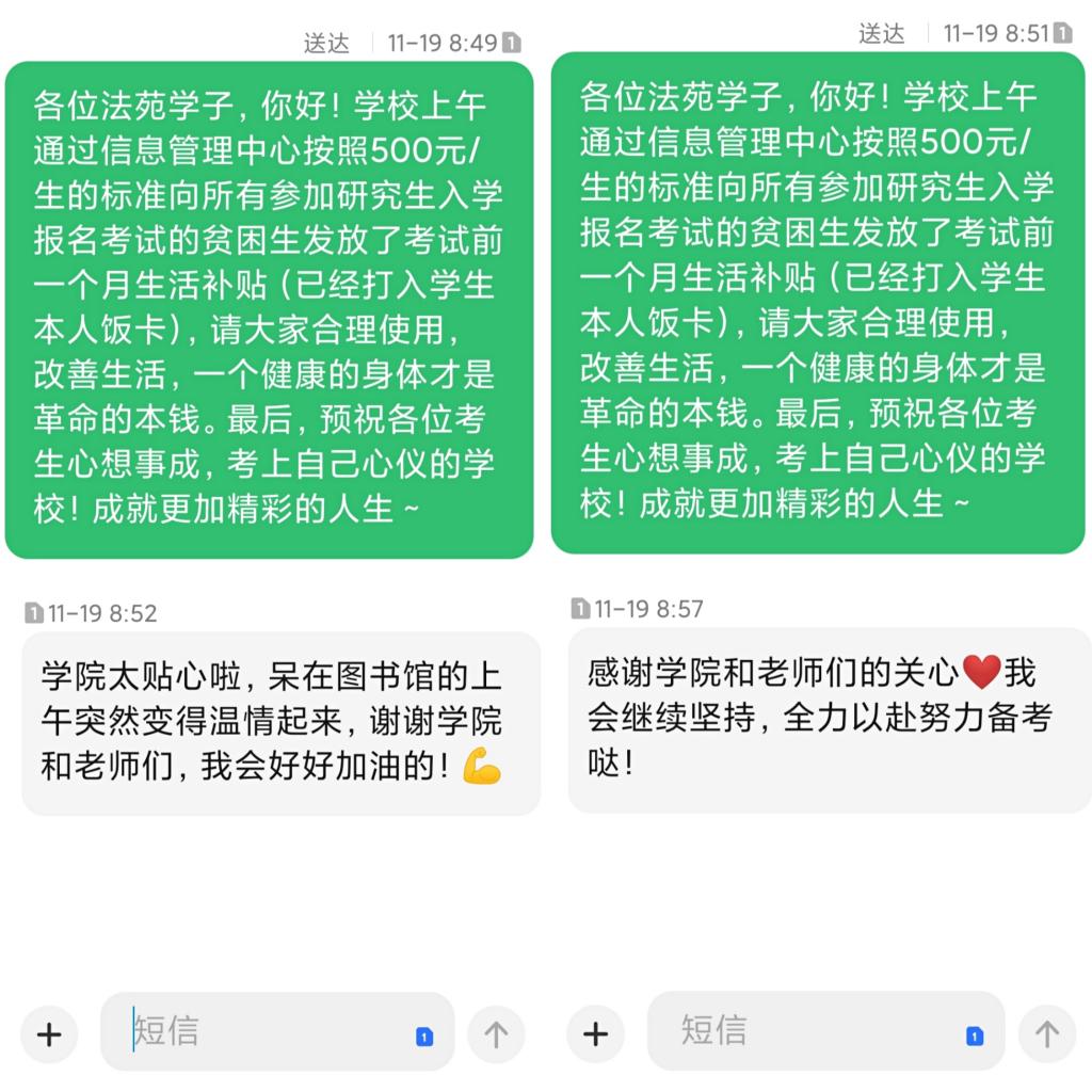 10月16日,公司召开“考研动员慰问会”,执行经理严宏、公司党委副书记王少仁与受资助员工进行畅聊,为考研学子发放牛奶、饼干等慰问品,鼓励同学们不惧前行困难、不忘报国之志,做到自强、自信、自立。11月中旬,公司通过信息管理中心按照500/元标准为所有参加研究生入学考试的贫困学子发放生活补贴,直接打入到饭卡中。员工纷纷表达了对公司的感激之情,并表示自己定会坚持不懈,全力以赴进行备考。