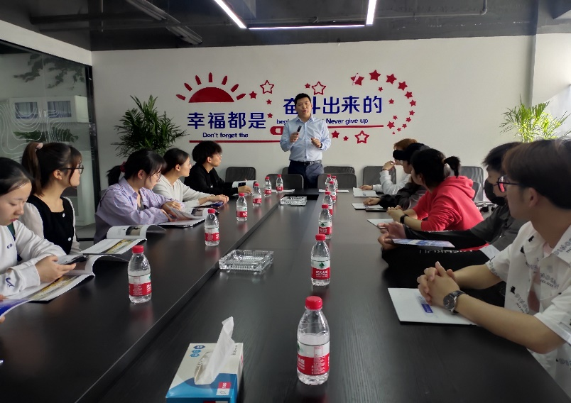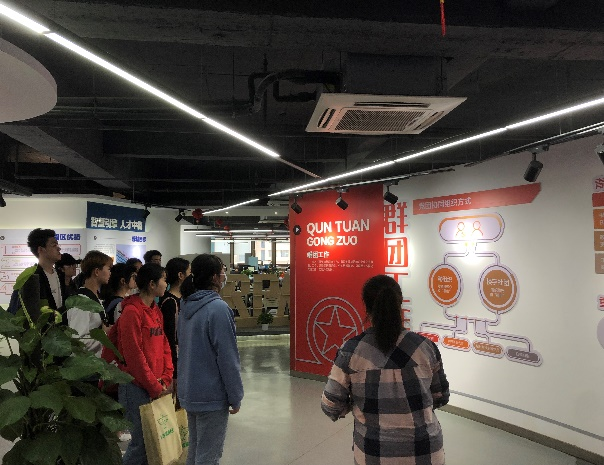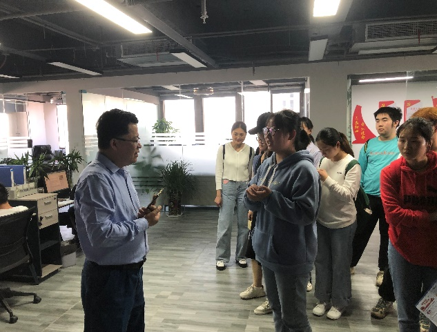介绍完产业园的基本情况后,同学们来到了产业园的两家企业,对就业市场进行了更为细致的了解。首先来到的是博纳德集团,该公司负责人热情接待了同学们,并对他们从本公司经营范围、发展方向、未来愿景和营业规模等几个方面展开了介绍,使得同学们对这一陌生的行业有了大概的认知。之后,同学们来到了安徽高铭人力资源有限公司。