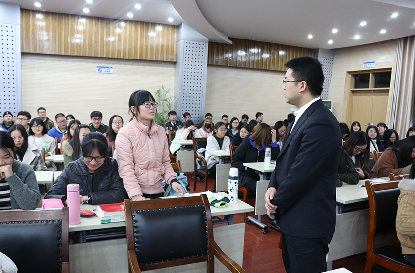 韩鹏围绕“以投资人的视角规划你的未来”这一主题,从自身工作经历谈起,带给同学们最真实的体验。他将把握趋势、构建组合、全面覆盖、深度调查、动态平衡等五个方面作为老员工职业规划的关键着眼点,并强调要主动适应新常态,灵活应对新常态,不可与趋势作对。他还为同学们详细解读了2016年安徽省普通高校毕业生就业状况报告,给同学们以启发。此外,韩鹏还通过列举自己身边成功的例子来证明打造核心竞争力的重要性。他激励同学们以坚守定位、明确目标为前提;以专心一致、勤于思考为基础;以忍受寂寞、砥砺前行为方向,创造出属于自己的精彩的老员工活。最后,李路根与谢长根也借此机会为同学们提出指导意见,激励同学们发奋图强,走向更美好的一天。讲座之后的交流环节,同学们积极地提出了自己的问题和困惑,韩鹏一一热心解答。