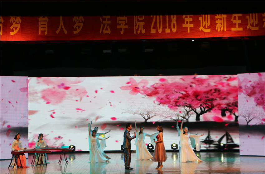 德法兼修法苑人,携手同创法治梦。第二篇章伊始,器乐伴奏《平凡之路》带领着场上的每一个人,跟随着音乐的脚步去旅行,穿越山和大海,也穿越人山人海,历经沧桑后寻得属于自己的不平凡。情景朗诵《星火》,朗诵者们声情并茂,以抑扬顿挫、铿锵有力的语调,娓娓道出从秦朝帝国到中华民国再到当代中国,法治进程的艰辛与不易,唤醒了全场观众的赤子之心,切合了十九大依法治国的理念,全方位展现了法苑学子的风采。研究生舞蹈《第五元素》,动感十足的音乐,充满活力的舞蹈,充分展现了法苑学子的青春活力。“桃之夭夭,灼灼其华。之子于归,宜其室家。”歌伴舞《桃之夭夭》再现了千年前诗经里的凄美爱情,月色凉凉,为你思念成河,死生契阔,唯独与子成说。醇净细腻的声线与柔美空灵的观感遥相呼应,形成默契的音乐气场,让观众在歌声里抵达三生三世桃花纷飞的庞大梦境。晚会的书页也由此翻向第三篇章。