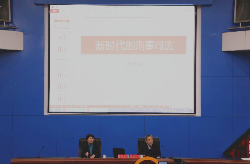 胡云腾围绕“新时代的刑事司法”这一主题,通过列举“聂树斌案”等一系列冤假错案的平反说明新时代刑事司法对人权保护及司法程序的重视,号召与会人员将十九大精神落实于工作与生活。他结合工作经验以分析图表数据的方式,就“刑事一审案件数量变化情况”、“排名前十的罪名分布情况”、“部分严重暴力犯罪案件数量变化情况”、“适用罪名数量变化情况”、“重刑率变化情况”等十个方面进行了详细介绍。他指出,刑事案件增长率的提高说明当今社会治安和管理仍然存在死角,犯罪网络化的现象不容忽视;刑事司法改革进程加快,刑事司法理念不断深入人心,暴力犯罪等严重刑事案件犯罪率持续下降,并介绍我国刑法实施取得的进步:打击力度到位、犯罪与刑罚进入了良性循环区。