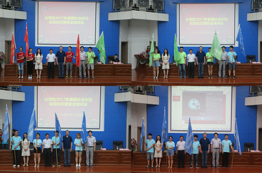屈光峰作简要总结并作动员发言,他向关心支持暑期社会实践的领导、老师表示感谢,向积极参加社会实践的同学表示亲切慰问和良好祝愿,并从人才培养的角度讲解社会实践的意义,呼吁大家紧扣“喜迎十九大,青春建新功”的主题开展实践活动,强调安全的重要性,要求大家在思想上重视到位、方案上落实到位和纪律上履行到位。此外,屈光峰鼓励大家做到:“突出主题,让青春融入伟大中国梦”、“强化服务,以奉献铭记浓浓百姓情”、“牢记责任,用平安走好芬芳的泥泞路”,以更好开展暑期社会实践活动。最后,与会领导老师为院级实践团队授旗。