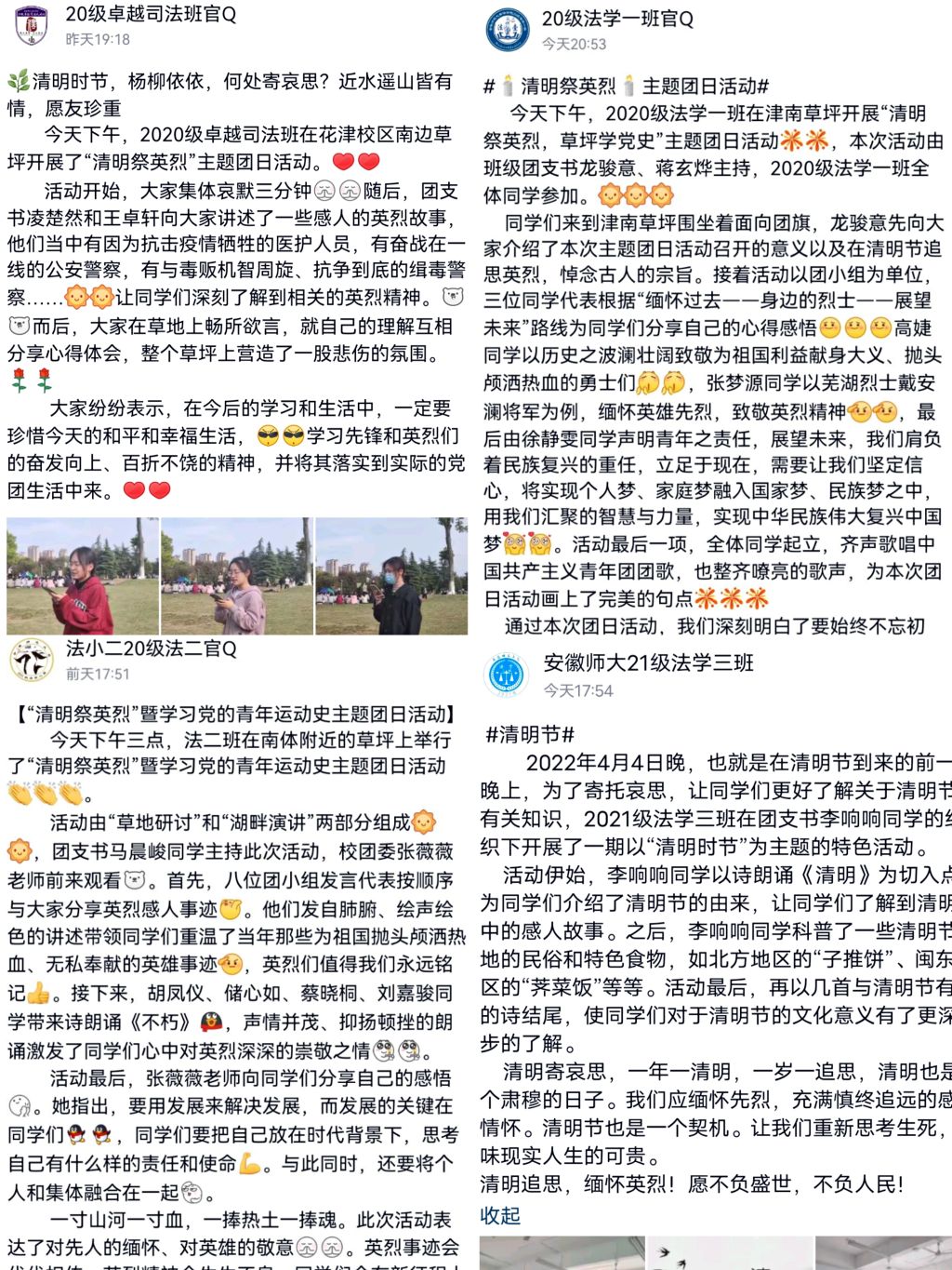 勿忘铁骨忠魂魄,学习气概贯长虹。围绕“清明祭英烈”主题,各团支部策划开展研讨活动。团员们围坐在一起,分享英烈事迹,总结交流学习经验,发言代表声情并茂的诗朗诵激起同学们对英烈为家国利益视死如归、慨然献身的崇敬之情,绘声绘色的讲述积极引导员工在慎终追远、缅怀前辈的情怀中认知传统、继承传统、弘扬传统,增进爱党、爱国情感。