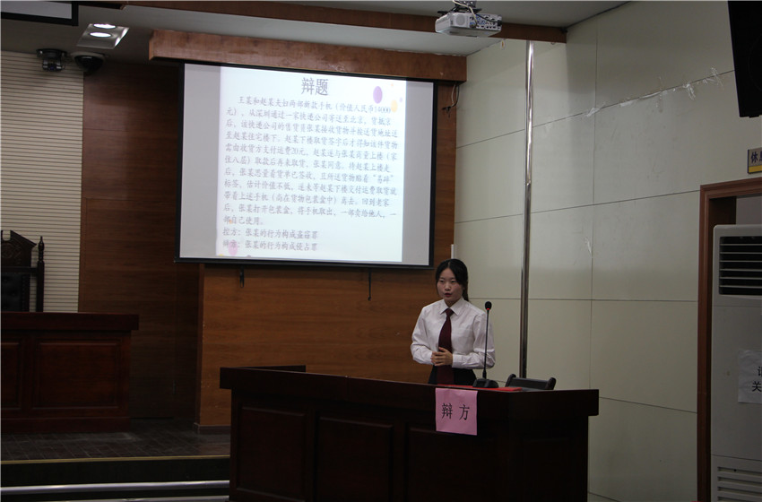 赛事伊始,主持人详细讲解辩题和规则。双方辩手有序上场进行答辩,他们在法庭陈述、法庭辩论、总结陈词各个环节中思路清晰,唇枪舌剑,互不相让。在法庭辩论环节中,双方就辩题中张某的行为应该如何定性展开更深层次的辩论,将比赛推向高潮。论辩是思想的武器,双方都能抓住案件事实的核心来抗辩,在发问环节中运用娴熟而巧妙的论辩技巧。辩手的问题极具设计感,层层推进的发问,缜密的安排、合理的论证、简明的表达为现场观众们带来一场精彩的法庭博弈。经过激烈的角逐,曾莉、周家宝、汤元帅三位同学凭借在场上的优异表现,获得“优秀辩手”称号,王睿同学因表现突出获得全场“最佳辩手”称号。