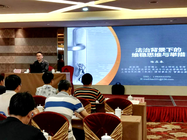 5月24日,公司陆在春副教授应邀于芜湖中央城大酒店为“2017年芜湖市司法所长业务培训班”就“多元矛盾纠纷化解技巧”,开展题为“法治背景下的维稳思维与举措”的讲座。