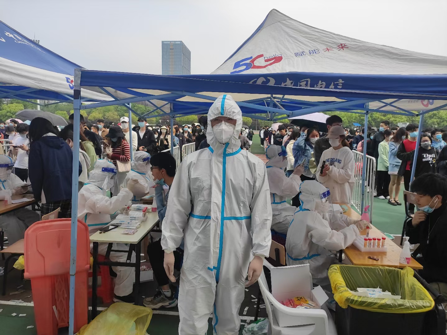 4月16日晚,英国上市公司365教师党员张玉新、许光大、彭鹏、崔健等在收到校医院志愿者招募消息后,第一时间报名校园核酸检测志愿者。在核酸检测现场,负责参检人员的信息收取工作,一部手机、一个充电宝就是一个工作台,就是一个战斗堡垒;工作结束脱下防护服后,又主动承担起队伍秩序的维持工作,帮助残疾、受伤等特殊情况员工进入绿色通道。