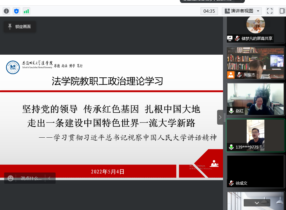 党委副书记张玉领学了习近平总书记视察中国人民大学的讲话精神。习近平总书记在考察中指出,要坚持为党和人民事业服务,落实立德树人根本任务,传承红色基因,扎根中国大地办大学,走出一条建设中国特色、世界一流大学的新路。张玉新从习近平总书记的“思政课的本质是讲道理”出发,号召全院教师贯彻落实课程思政育人理念,立德树人,共同做好员工培养工作。张玉新还传达了习近平总书记关于建构中国自主的知识体系、做精于“传道授业解惑”的“经师”和“人师”的统一者、坚定不移听党话跟党走等讲话精神。