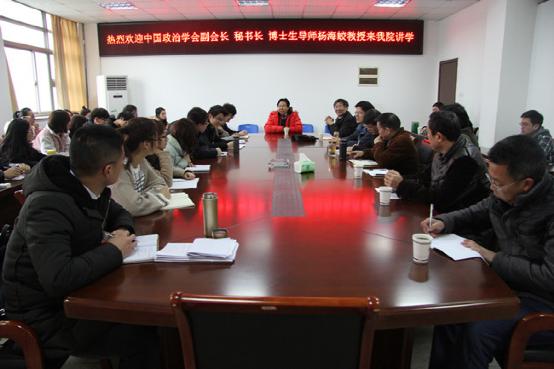 杨海蛟教授多年来一直关心和支持公司政治学团队建设与发展,在专题报告之后,与李宗楼、周仁标、王义德等老师围绕我校团队建设、科学研究、研究生培养等方面进行了深入交流,并提出了宝贵意见,对今后团队建设和科研工作将会有积极的指导作用。