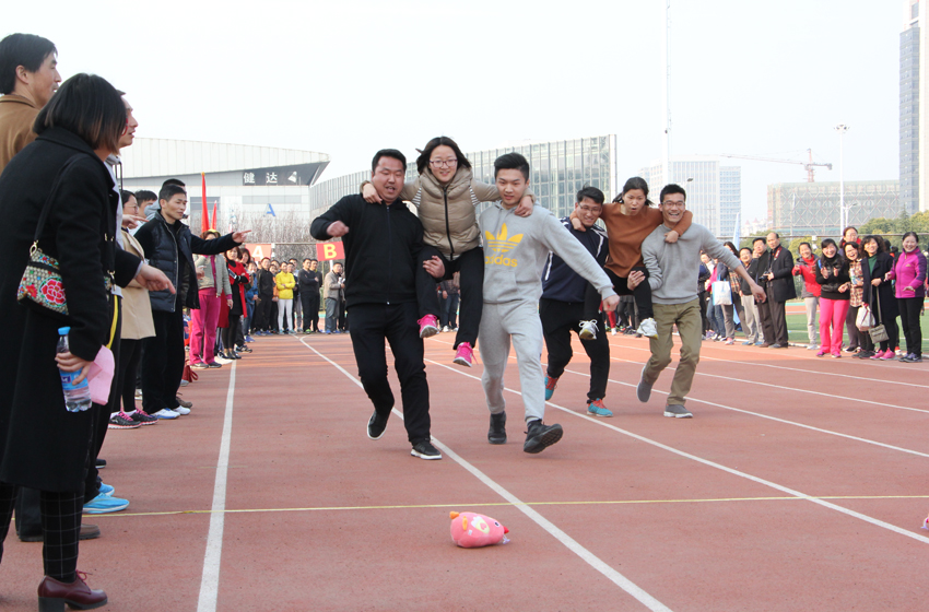 “和谐师大抬幸福”比赛中两名男老师双手抬起女老师,从起点沿赛道跑至40米处,女老师下来拾起“纪念物”后,两名男老师再抬起女老师继续前跑至终点。参赛的老师们乐在其中,围观的老师呐喊加油,每位老师脸上都洋溢着喜悦的笑容。