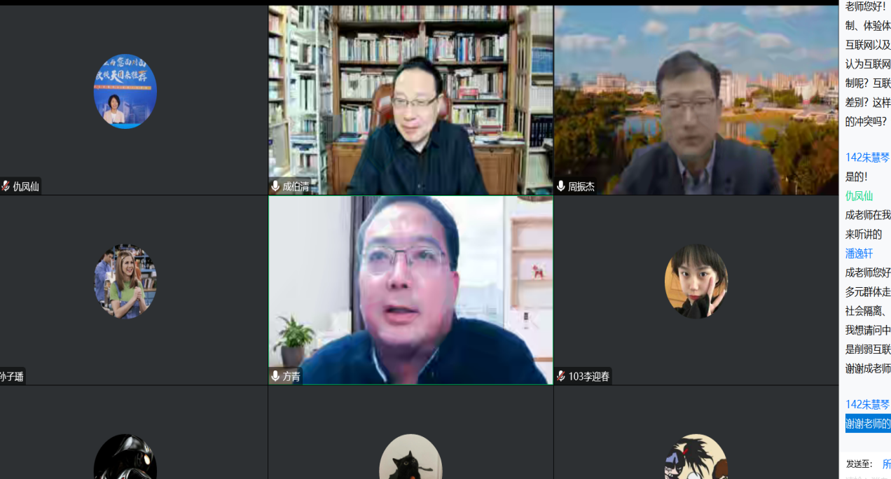 在交流讨论环节,成教授针对网络交往是否比现实来往更具情感性、网络上重现于类似文艺复兴的畅想、核酸乱象的网络评议和怨恨情绪以及背德倾向的CP视频中存在的道德焦虑问题一一详细回答。