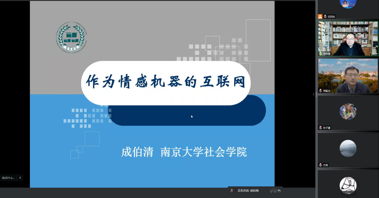 讲座伊始,成伯清教授指出我们处在一个大智移云区时代,信息技术的发展改变了我们当今社会的基本运作方式,在这样的背景下我们如何应对?成教授从情感社会学的角度关心人的感觉以及人的命运发展问题切入,对互联网认知从工具到伴侣、从访问到沉浸、从现实到虚拟、从自发到算法、从社交到社恐、从信息交流到情感机器等方面分析了当下互联网的角色转变。他认为认为互联网得以迅猛发展的社会条件源于越来越原子化的社会和情感淡漠的“无缘社会”。成伯清教授认为现代社会个体内在价值的失守和社会系统的演变是情感操纵的内外条件,而商业化、个体化和医学化的情感解析方式则是造成当代社会个体和群体情感问题的肇因和实质。最后成教授告诫我们在网络时代,我们人类心灵和社会性情深受互联网秩序影响,互联网可能创造出一个相似性的自恋圈层,分割成为形形色色的圈子和派系,网络的巴尔干化,在社会认同普遍出现危机的状态状态下,全球化的部落化现实性,我们需要对此保持足够的反思和警惕。