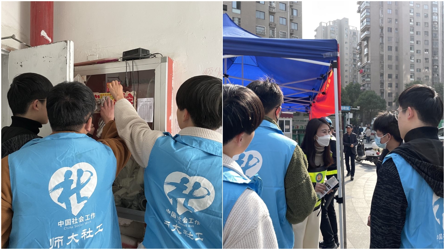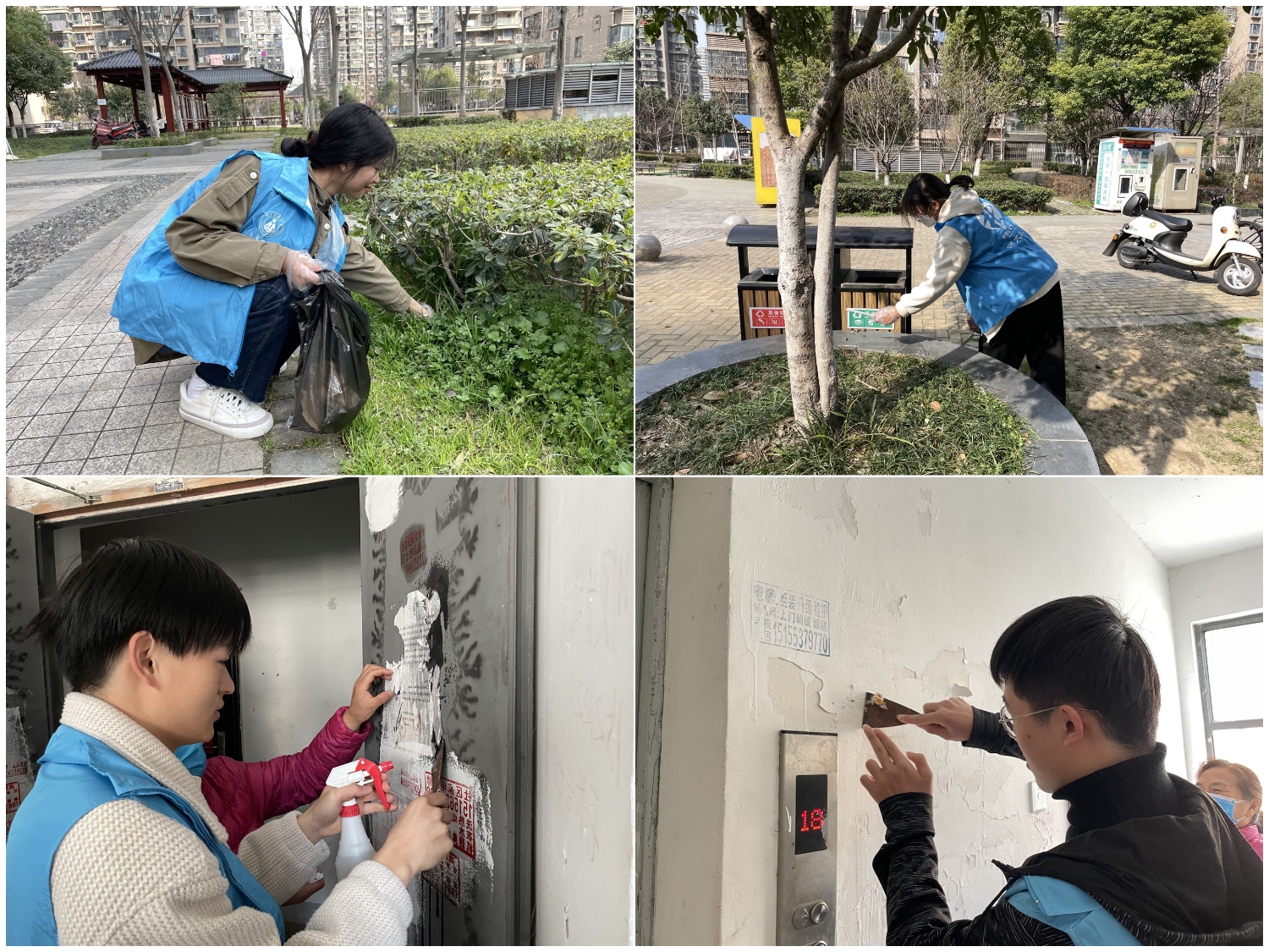 初春,一缕缕阳光氤氲开来,暖暖地铺撒在大地上。在社区工作人员的带领下,志愿服务队分成三组,深入社区协助做好卫生清洁、秩序维护和助老服务。一组女生同学纷纷戴上手套,每人手持一个垃圾袋,不停弯腰拾起广场花坛和道路之上的垃圾,为社区环境卫生建设贡献力量。另一组同学则发挥男生的力量优势,将社区内的停放略显杂乱的电动车一一摆放整齐。除此之外,同学们还配合社区环卫工人铲除电线杆上以及楼道内墙壁上贴的小广告,帮助保安维持社区的交通秩序,并引导老人到服务点进行简单的健康检查。同学们在社工服务实践中深刻把握雷锋精神的时代内涵,加强志愿服务保障和支持,让学雷锋活动融入日常、化作经常。