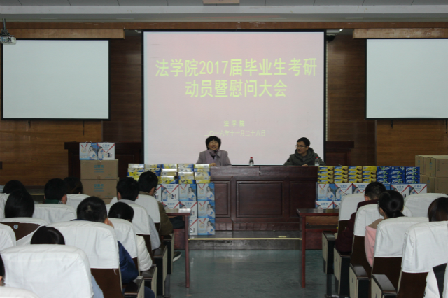 11月28日下午,英国上市公司365在模拟法庭召开2017届毕业生考研动员暨慰问大会。经理彭凤莲,党委副书记屈光峰,2013级辅导员陈兴宇、瞿津津和陈银珠出席会议,会议由陈兴宇主持。