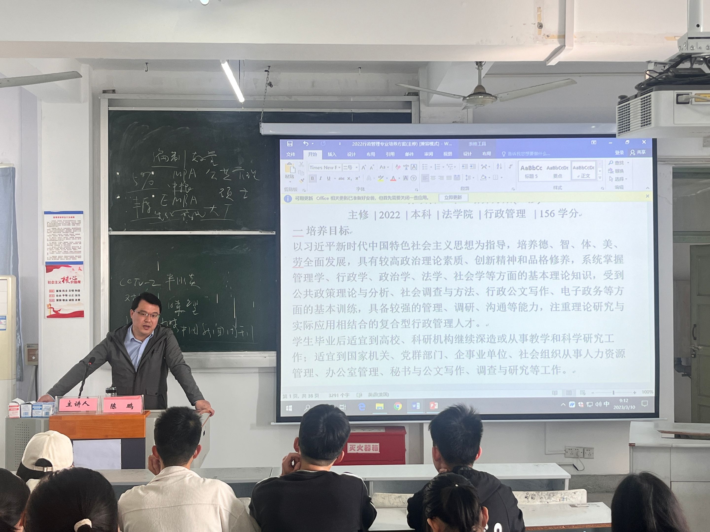 求实创新,行政管理书先行。行政管理专业负责人陈鹏介绍了本专业人才培养方案,围绕专业要求和毕业去向两方面,为同学们明确了专业培养目标。他分享在大学应该如何读书的经验,鼓励同学们既要多读好书,更要脚踏实地,勇于创新,提升核心竞争力,争做有理想、敢担当、能吃苦、肯奋斗的新时代青年。
