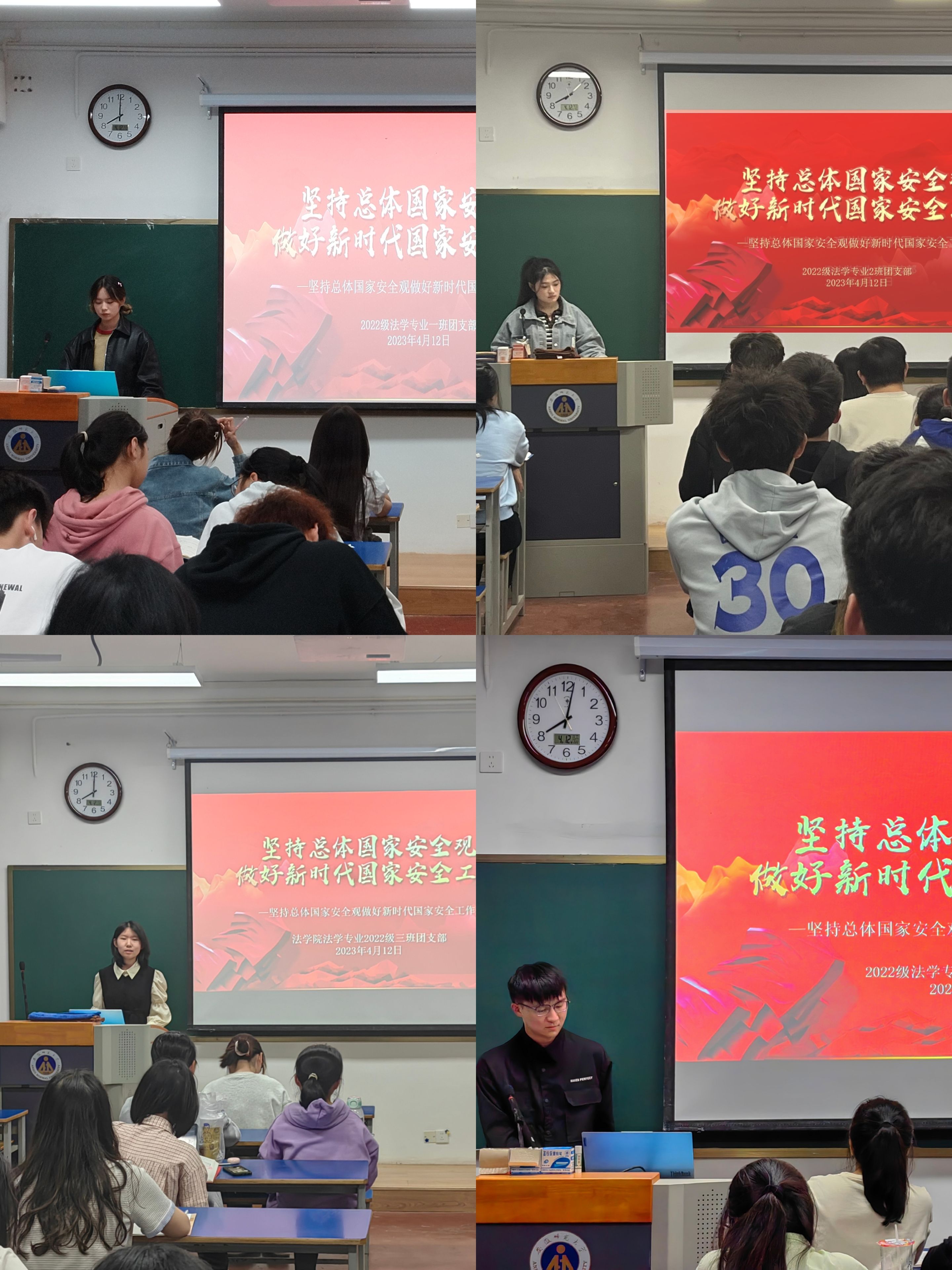 统一思想明任务,铁心向党筑防线。2022级法学专业团支部组织开展“坚持总体国家安全观,做好新时代国家安全工作”主题团日活动。各班级团支书从“何为总体国家安全观”“总体国家安全观包括哪些”以及“生活中如何践行总体国家安全观”等国家安全知识,助力提升同学们的国家安全意识,筑牢国家安全防线。2022级法学一班团支书赖嘉怡表示“国家安全是安邦定国的重要基石,维护国家安全是全国各族人民根本利益所在,也是每个公民的责任,我们需要扮演好自己的角色,发挥好自己的力量,积极践行总体国家安全观”。2022级法学二班团支书张馨予提出“‘天下虽安,忘战必危’,国际环境复杂多变,国家安全与我们每个人息息相关,应牢记总体国家安全观”。2022级法学三班团支书张肃婉指出“家是最小国,国是千万家国家兴亡,匹夫有责,作为当代青年老员工,我们每一个人都应切实承担起维护国家安全的责任,坚守总体国家安全观”。2022级卓越司法班团支书李公全强调“‘备豫不虞,为国常道’,新形势下我国国家安全和社会安全面临的威胁和挑战增多,需要我们老员工坚持总体国家安全观。”