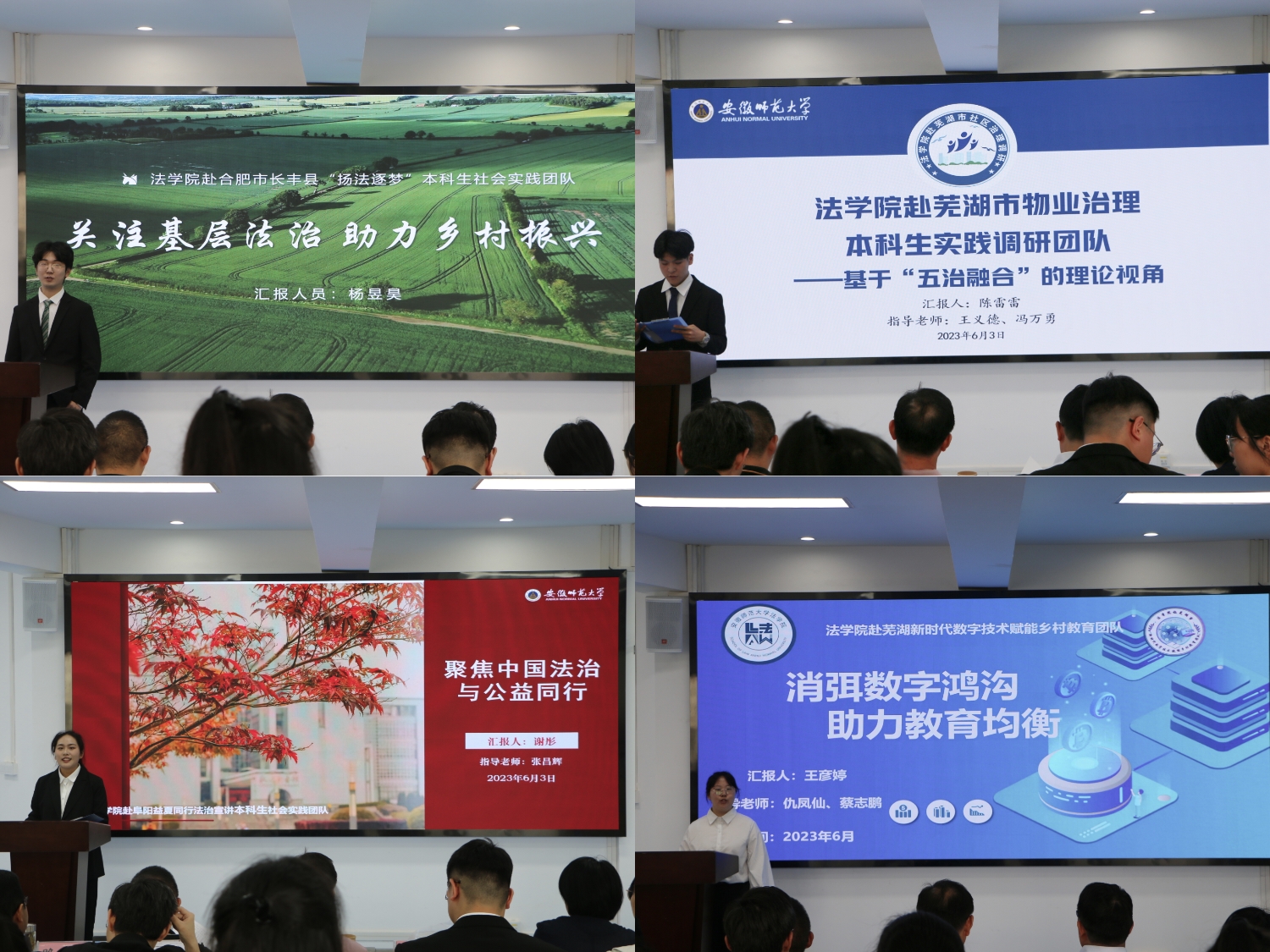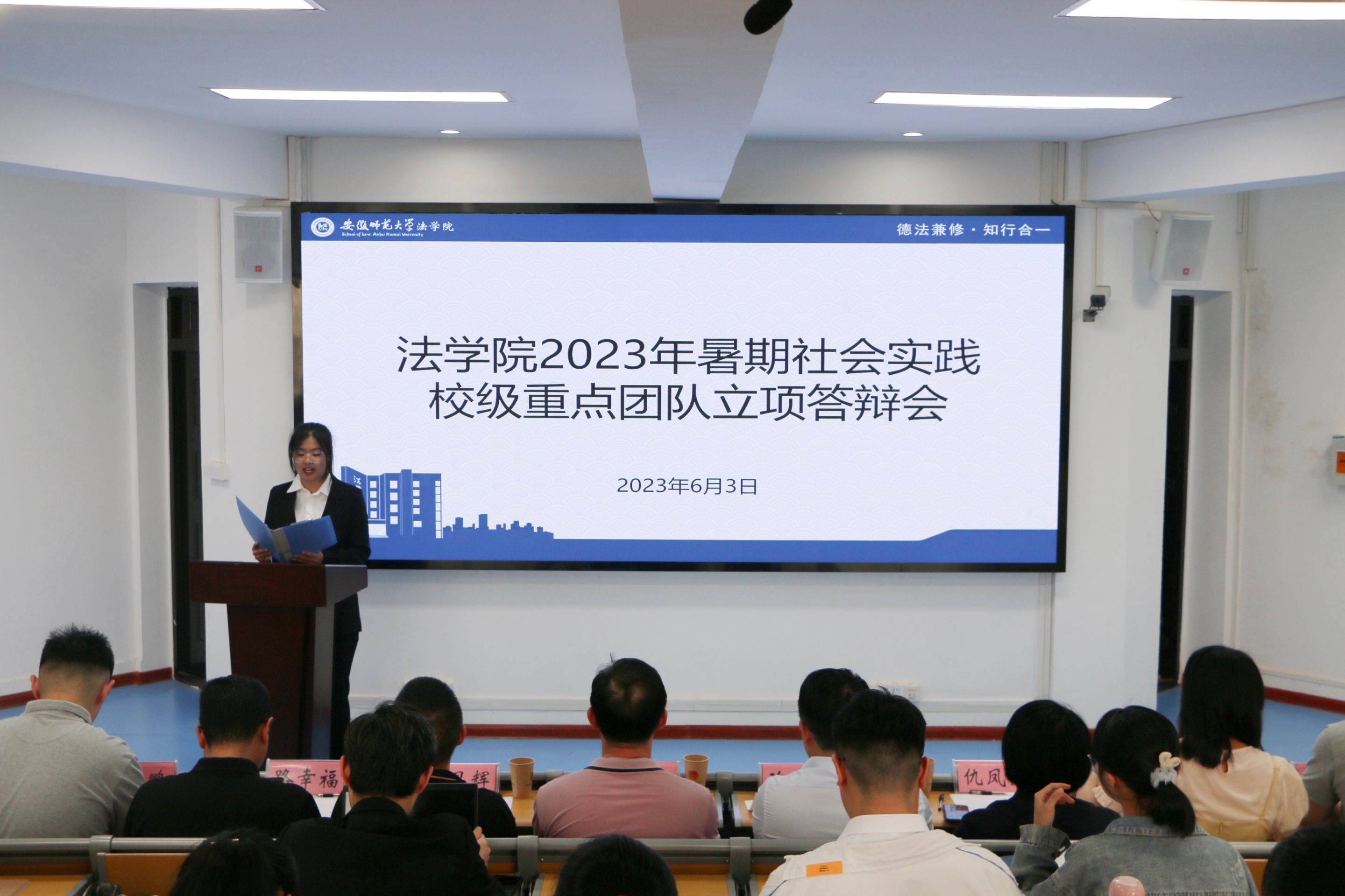 此次答辩共有30支队伍参加,各团队负责人结合PPT,围绕实践背景与目的、前期准备、活动方案、团队成员、经费预算、应急方案等方面进行汇报。各队实践选题与所学专业及时政热点联系紧密,包括红色文化、环境保护、乡村振兴、习近平法治思想宣讲、反电信诈骗宣传等诸多方面。