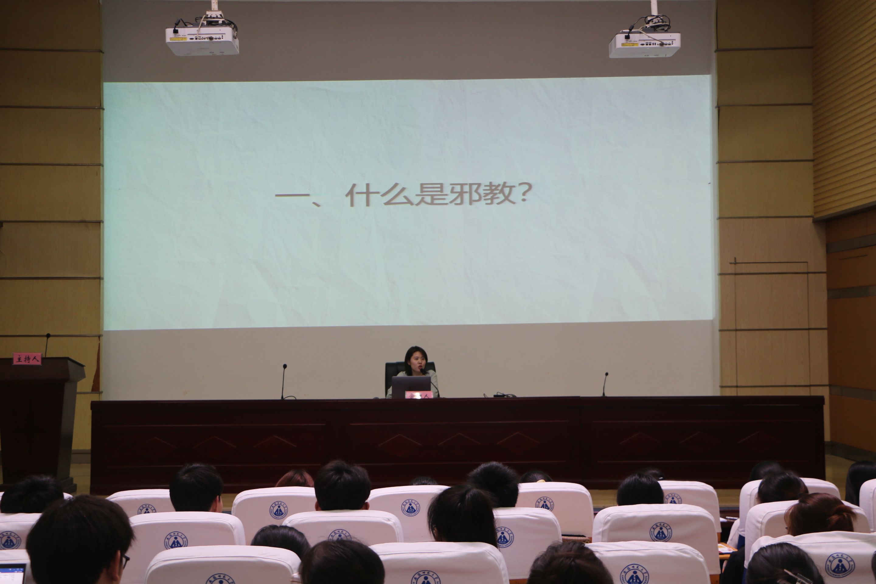 活动伊始,市委政法委反邪教协调科科长、市反邪教宣讲团成员朱婷婷从讲解邪教的本质入手,通过有奖问答和观看宣传片等方式帮助同学们了解邪教对个体身心健康、家庭和睦、社会稳定、国家发展的危害,引导同学们崇尚科学、传播文明反对邪教、远离邪教