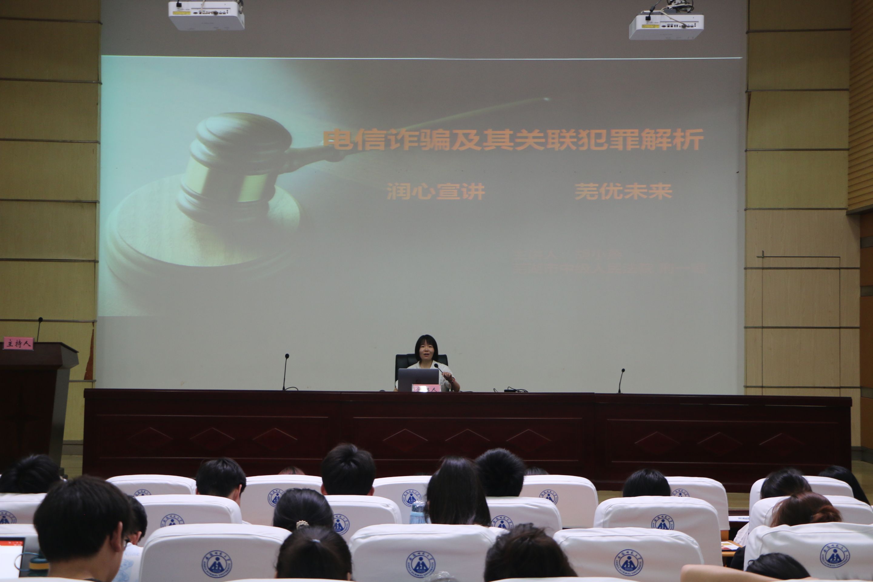 随后,市中级人民法院员额法官、市法学会“润心”法治宣讲团成员胡小燕通过以案说法、警示教育等形式,向同学们讲解网络刷单、冒充电商物流客服等多种诈骗手段及方式,将犯罪分子惯用诈骗手段进行曝光并就高校员工“如何鉴别和预防电信网络诈骗”提出若干建议。