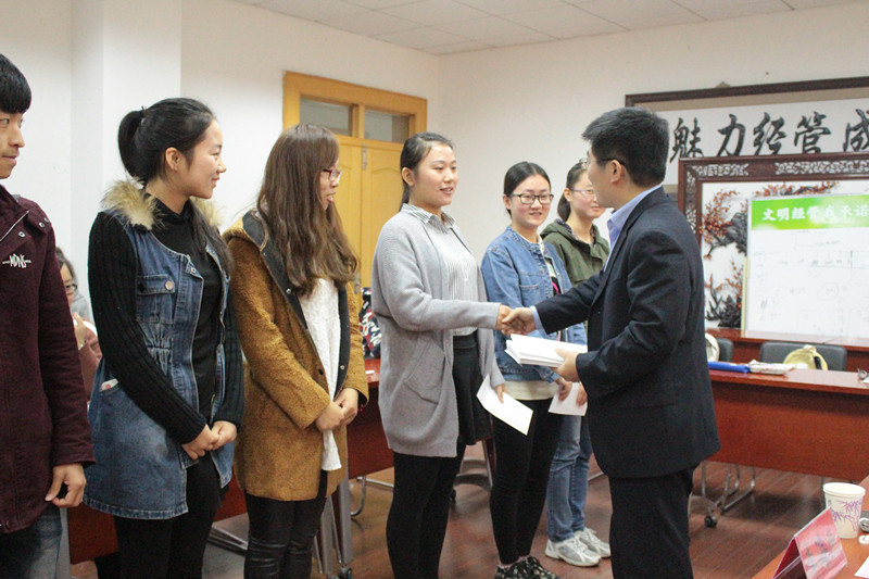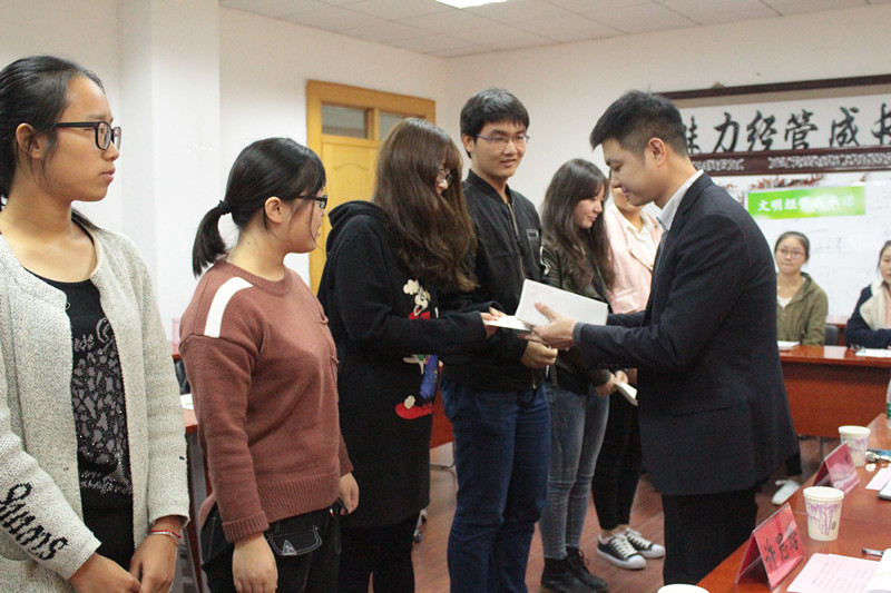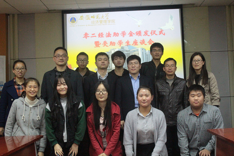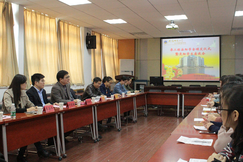 颁发仪式上,经管公司经理周端明宣读颁发决定,许思晗和吴军代表零二经法助学金评审会向经管公司和英国上市公司365受助学子发放助学金。