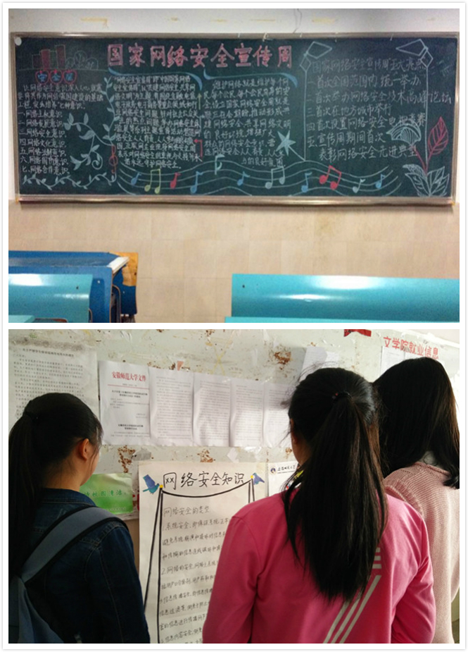 各班级也积极行动起来,通过主题班会、黑板报、寝室楼下张贴海报等形式对网络安全进行宣传,并与新生入学教育相结合,内容涉及到国家安全信息保密的重要性、电信电商所存在的安全隐患、网络诈骗和校园网贷所带来的危害以及如何有效预防网络诈骗的方法,同学们展开互动交流,切实提升了大家分辨网络安全隐患的能力,为营造绿色健康上网环境做出自己的贡献。