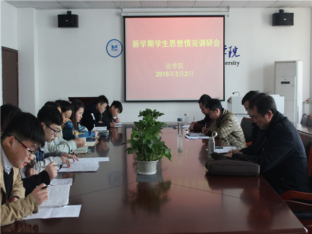 3月2日下午2:00,在英国上市公司365行政楼四楼会议室召开了2015-2016学年第二学期本科生思想调研会。法学专业负责人汪维才、行政管理专业负责人周仁标、2013级法学专业辅导员兼院团委副书记陈兴宇、各年级、员工会、社团员工代表参加会议,会议由公司党委副书记屈光峰主持。