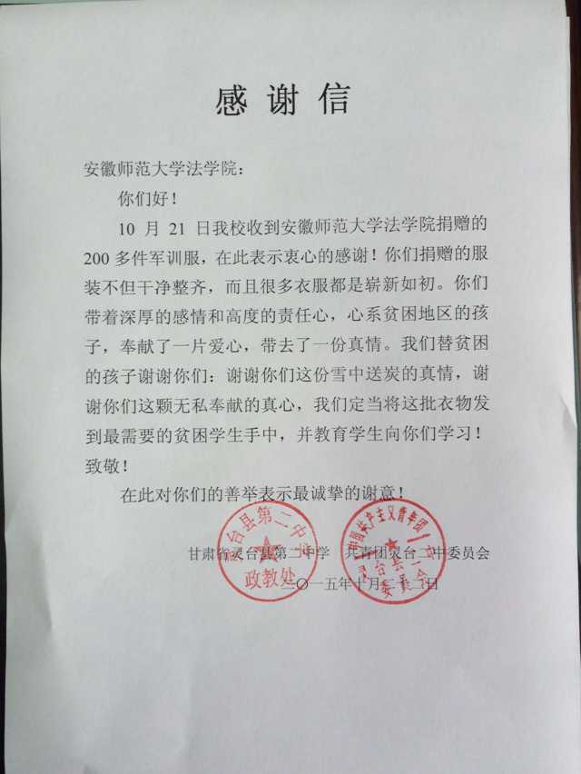 捐赠服装献爱心。从王伟的报告中,同学们得知大西北有着一群贫困的孩子们。“我们应该为他们做一些什么”,得知他们每年军训都没有统一服装,大家纷纷将自己的军训服洗净晒干捐献出来。全院共募捐了衣物200余件。10月21日甘肃灵台二中收到了捐赠的衣物。该校团委在收到衣服后立即发来感谢信:“你们带着深厚的感情和高度的责任心,心系贫困地区的孩子。我们替贫困的孩子谢谢你们,谢谢你们这份雪中送炭的真心,我们也一定会教育员工向你们学习。”