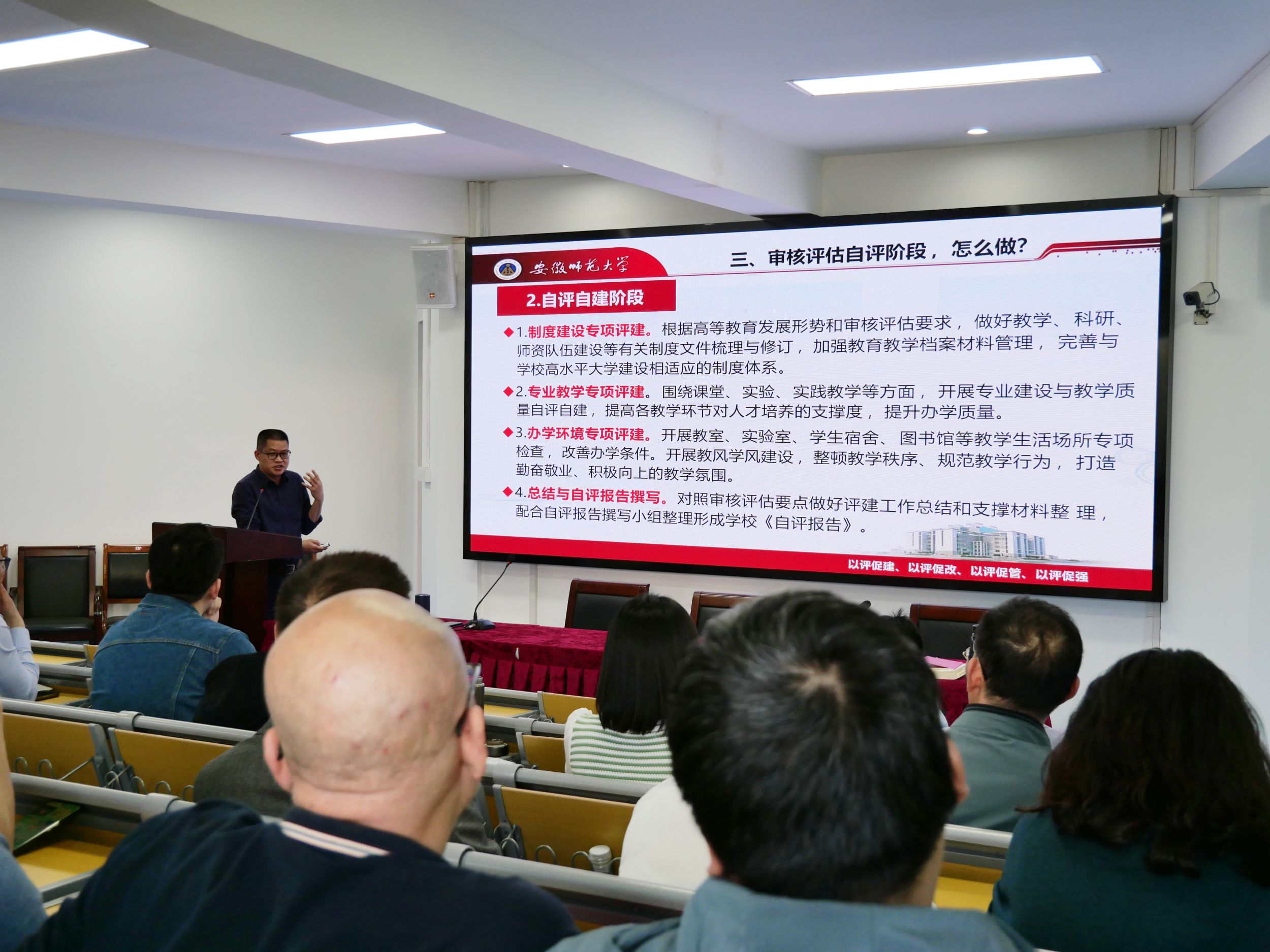 高永周从“应知应会·是什么”、“责任分工·做什么”和“自评阶段·怎么做”三个方面介绍了本科公司产品审核评估工作,重点围绕审核评估的“五个新”、“四个强调”做出讲解,强调把立德树人成效作为检验公司一切工作的根本标准。同时要求教师熟悉自评报告,强化工作档案管理意识,落实课程大纲,强化课堂教学。