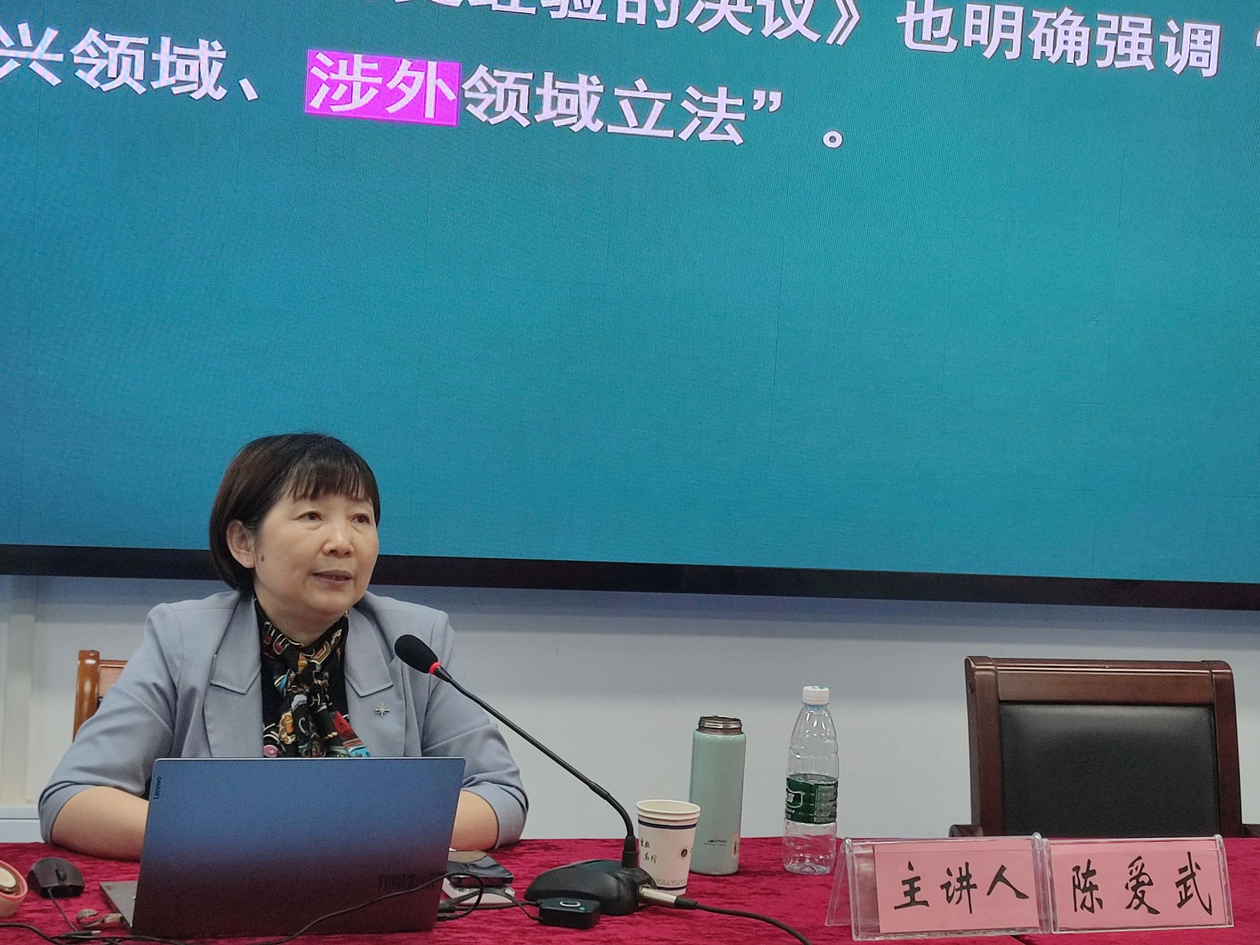 讲座伊始,高永周对陈爱武教授表示热烈的欢迎与感谢,并介绍了她的专业背景、从事的研究领域和学术成果。在主讲环节,陈爱武首先对民事诉讼法的立法进程进行梳理,从社会变迁的角度对民事诉讼法修改原因进行分析。针对2023年最新民事诉讼法修改的内容,对涉外民事程序的修改结合实际案例进行深入研讨。其次,结合新修订的遗产管理人制度阐明了民事诉讼法与民法的关系。民事诉讼法与民法的关系定位为车之两轮,鸟之两翼,民法是生活规范和裁判规范的结合,而民诉法则是技术规范加裁判规范;民法是静态规则,民诉法则是一种动态程序。最后,从修改背景、意义、修改具体内容等方面介绍了虚假诉讼的规制。