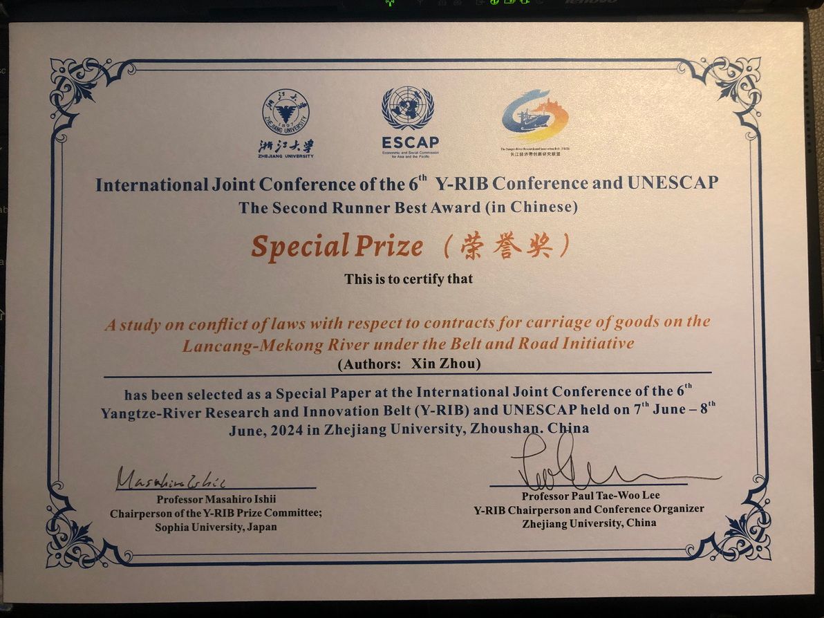 公司周新副教授应邀参会,就南美洲的内河运输(IWT)尤其是澜沧江-湄公河(Lancang-Mekong River)货物运输通道建设、法律冲突及协调等议题,与来自南美(线上)以及印度、老挝、泰国、柬埔寨、越南、湄公河委员会(MRC)(线下)的专家、学者探讨交流,并以“A Study on Conflict of laws with Respect to Contracts for Carriage of Goods on the Lancang-Mekong River under the Belt and Road Initiative(一带一路倡议下澜沧江-湄公河货物运输合同法律冲突及协调问题研究)”为题,在专题分会场做20分钟汇报分享。同名英文论文入选本次会议“Best Papers”,获颁“Second Runner Best Award”证书。