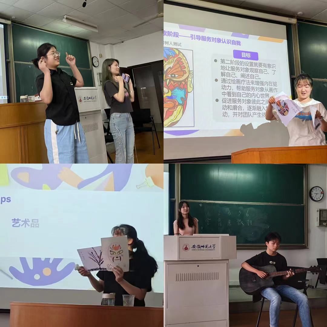 其中,王思嘉组的同学们巧妙地将绘画疗法的实务应用与本学期所学内容相结合,全面展示了绘画疗法团体辅导的完整流程。从曼陀罗绘画引导表达,经房树人测试探索自我,到纸巾变花、吹墨画梅悦纳自我,再到泡泡画、立体模型挑战自我,最终通过礼物制作升华自我。整个过程不仅展现了绘画艺术的独特魅力,更实现了情感与艺术的完美融合。辛祎可组、李倩文组、漆浩组、任静组以及朱其琪组,通过各自独特的演唱方式,展示了音乐的多样性和表现力。他们选曲如《社工之歌》、《明天会更好》,既展现了社工的奉献与使命,也表达了对美好未来的憧憬与期待。李于茜组用舞蹈展现社工的活力和激情,传递真挚的情感。郭晓彤组、周喆组巧妙运用角色扮演和对话交流的形式,将意象对话技术的核心理念展现得淋漓尽致,即通过诱导案主做想象,了解案主的潜意识心理冲突,并对其潜意识的意象进行修改,从而达到治疗效果。张佳鑫组完整演绎了个案工作的辅导过程,从接案到结案,每一步都展示得细致入微,使同学们更好地理解和掌握个案工作的知识和技能。姚宇杰组的相声和刘浩组的脱口秀更是为现场增添了不少欢乐气氛,展现了社工人的幽默与智慧。同学们的表演生动、真挚,将社会工作的专业性与艺术性完美融合,赢得了在场师生的一致好评。