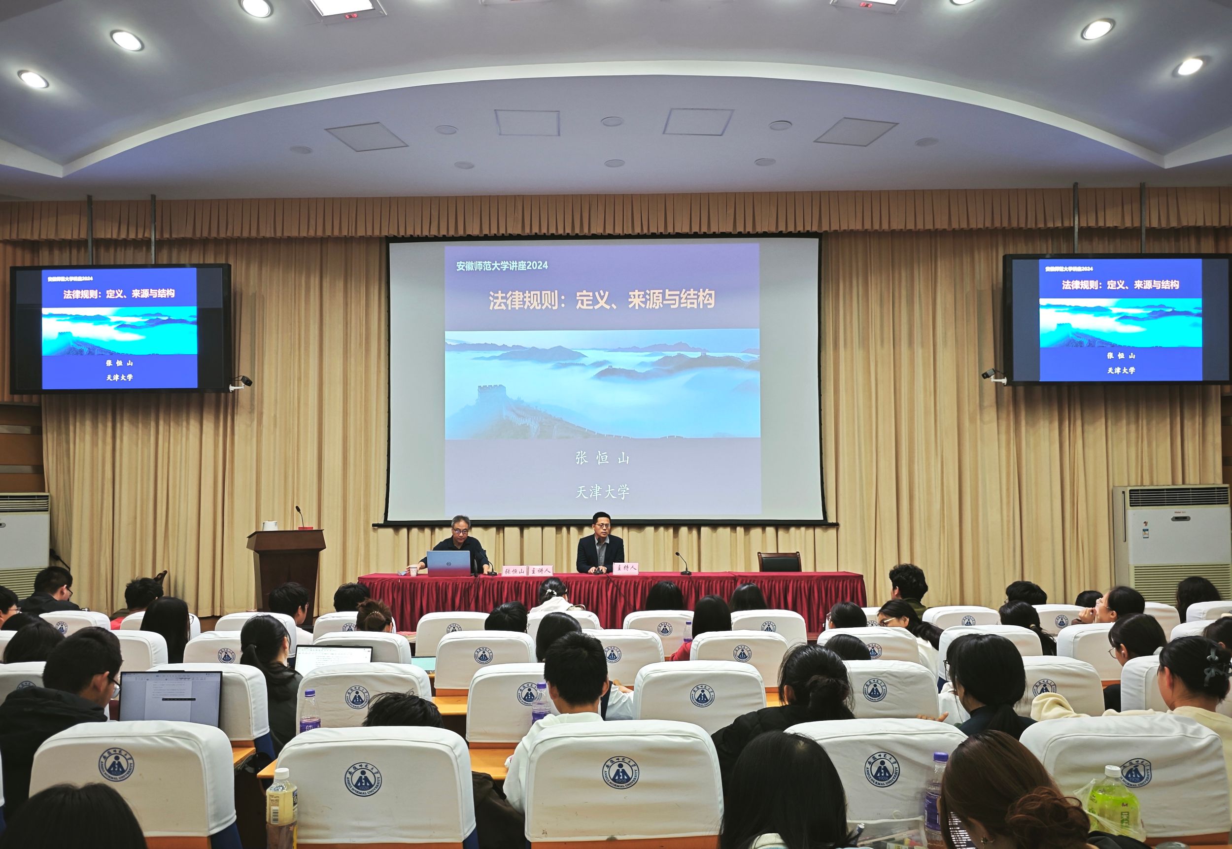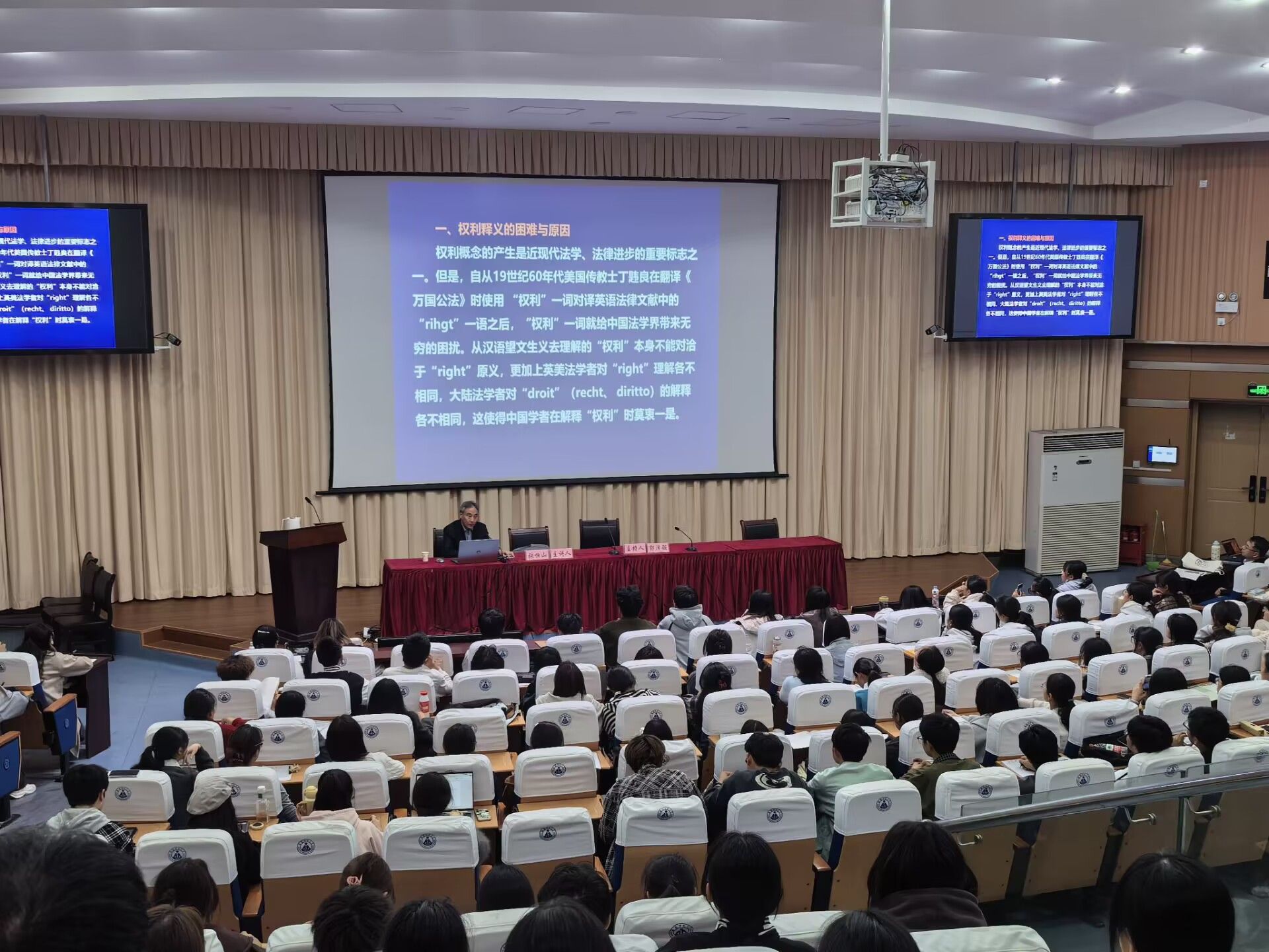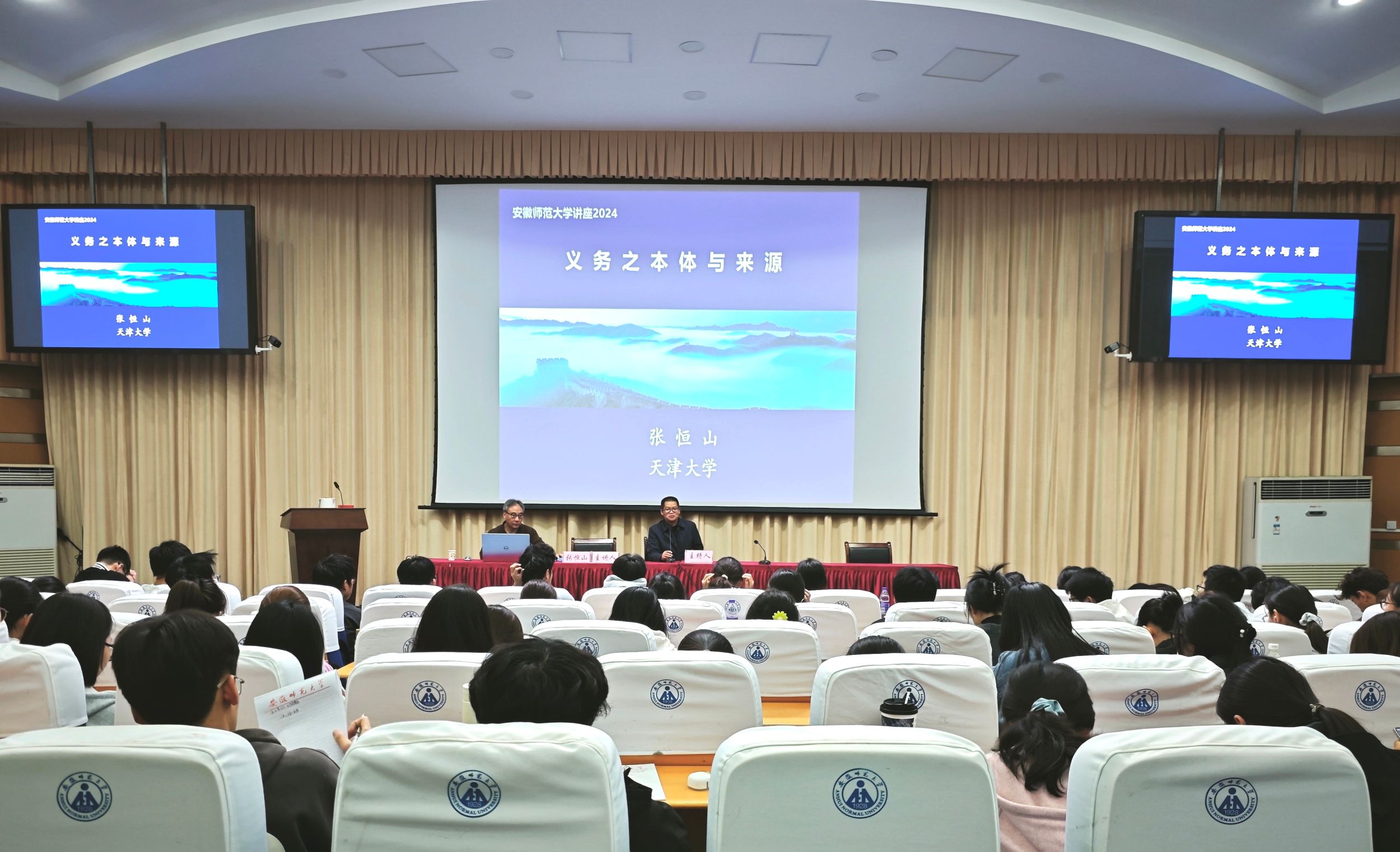 本次讲课分为三讲,分别是《权利结构、权利本体与权利功能》《义务之本体与来源》《法则:定义、来源与结律规构》。张恒山教授首先就法律中的权利与义务的内在本质与相互联系展开了论述,对法律是什么、义务是什么、权利是什么等做了深入浅出的分析,从法理学的基础切入,以法律规则为出发点,探讨个人行为与规则的关系,以权利和义务的关系,让大家思考究竟何为义务、何为权利,引导员工树立“义务不是武力强制的结果,是来源于道德和良知的反思”的义务观。随后,引出了以三人社会为基本支撑模式,以正义为主题、以义务先定为特色观点的法理学框架。讲座结束,张恒山教授与在场师生共同探讨学术问题,并给予同学们专业、详尽的解答,令在场的每一位同学都受益匪浅。