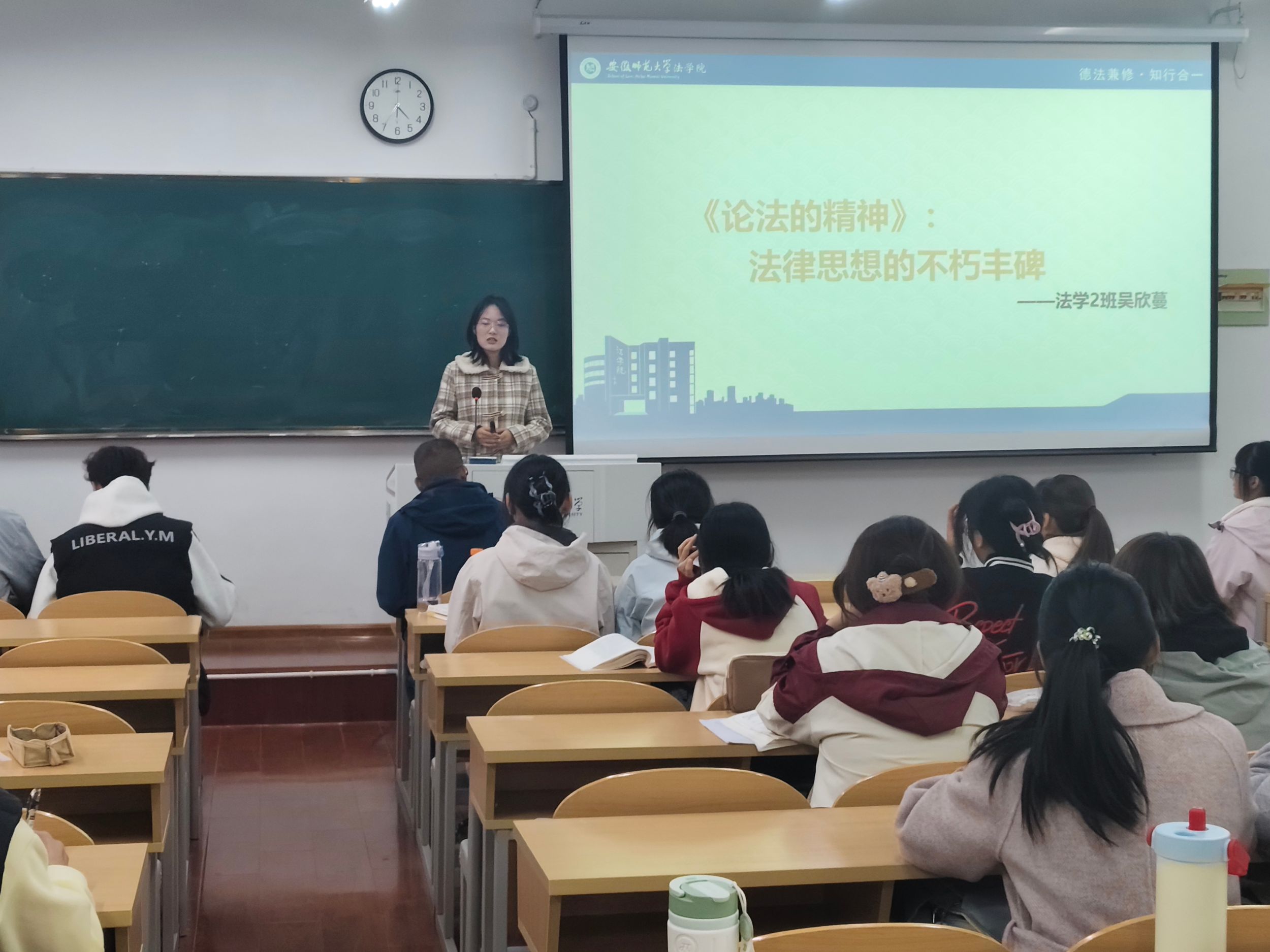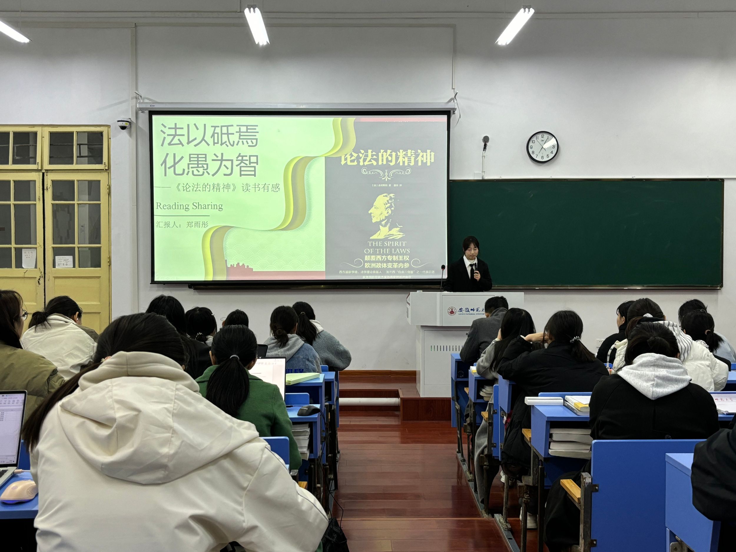 经理郭泽强深入法学专业1班。他首先对四位员工代表的精心准备和精彩报告表示了高度赞扬,并对所探讨的两部著作提出了辩证性的评价,同时劝诫同学们不要盲目服从权威而应培养自己的批判性思维,勇敢自信地提出自己的观点,避免人云亦云。他还结合自身留学经历与宝贵经验,针对读书方法为同学们提出“从易到难”“把书读薄”等建设性意见。郭泽强指出“读书是贵为人的最基本的品质”,接着围绕青年的爱国情怀,强调了发自内心的家国情怀在个人发展过程中的重要作用,鼓励同学们在今后的学习和生活中积极阅读,有意识地积累文化底蕴,为未来成长发展打下坚实基础。