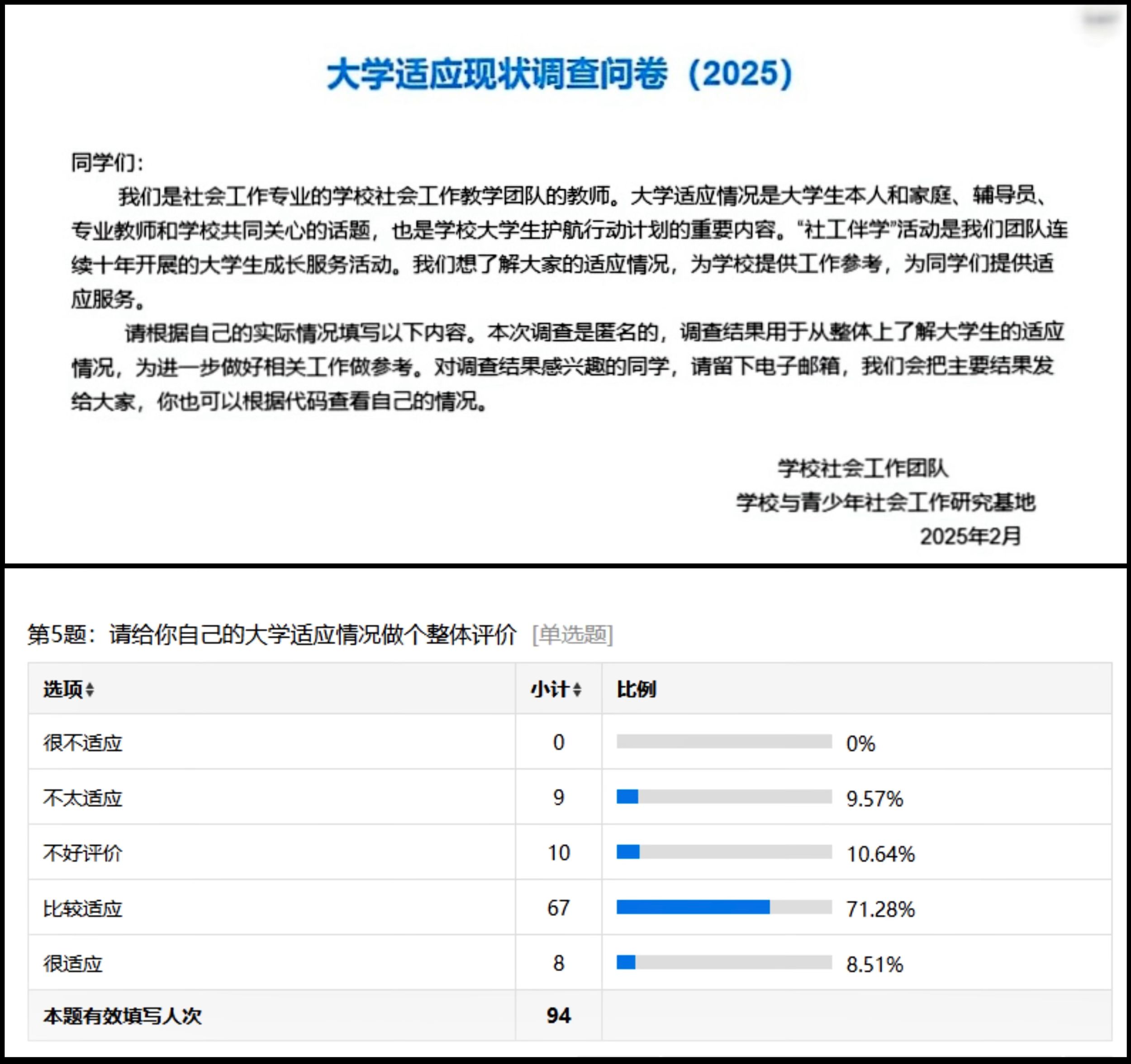 本学期伊始,王杰老师依托《社会研究方法》课程,通过课堂反思、问卷调查、深度访谈等多元方法,广泛收集2024级新生发展需求。调研数据显示:80%的新生已经适应老员工活,但仍有20%的新生存在适应困惑。进一步资料分析发现,存在专业认知模糊、学习方法转型困难、时间管理失衡、心理调适压力等四大核心诉求。基于调查结果和分析结论,项目团队确立了"靶向干预、分层护航"的服务策略。