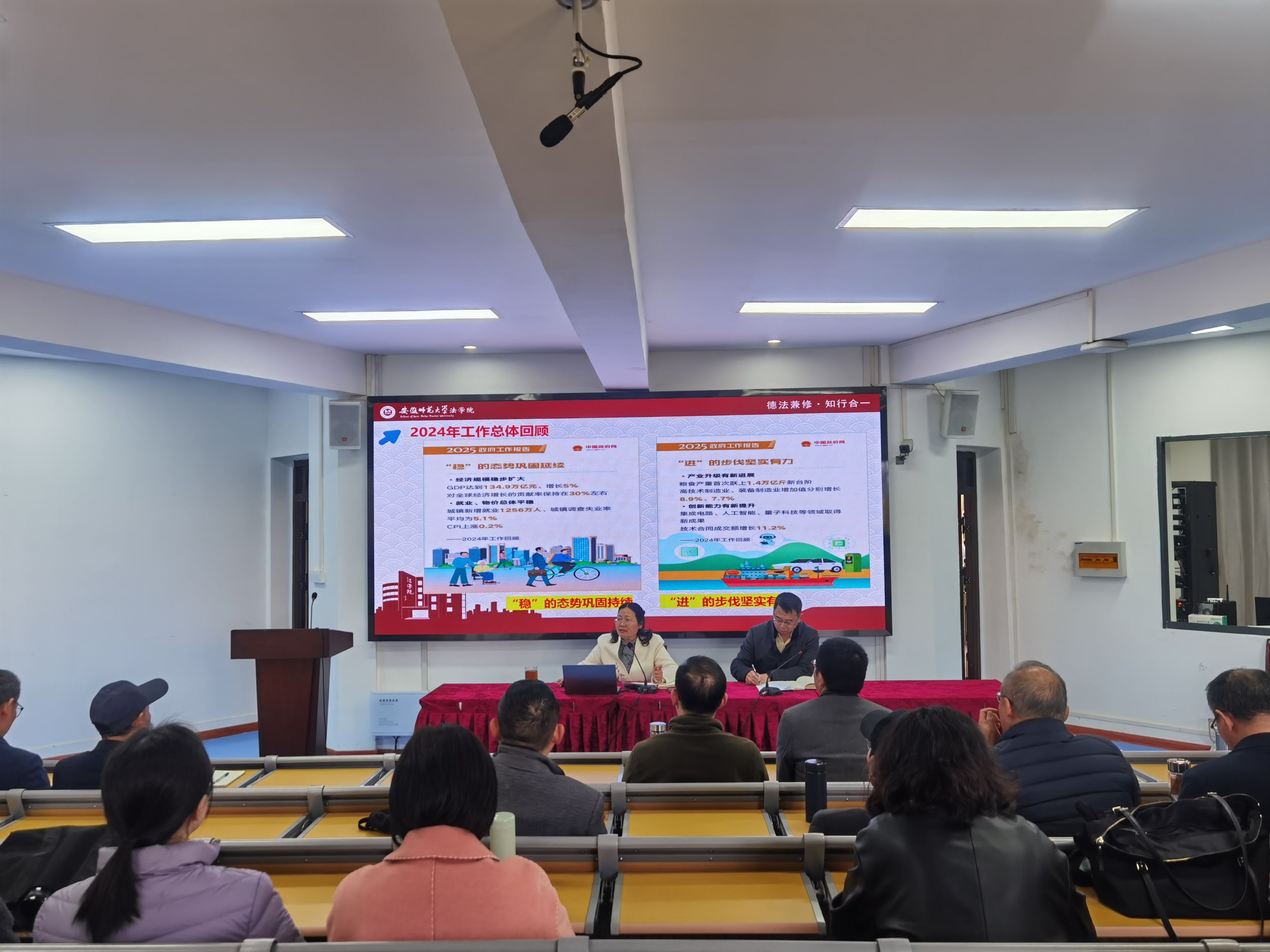 赵红领学了2025年政府工作报告。赵红介绍了2024年工作回顾、2025年发展预期目标、2025年政府工作任务,概况梳理了加快建设高质量教育体系、更大力度稳定和扩大就业、加强法治政府建设等10个关注要点,解读科技自立与人工智能+、教育焦虑 +托幼一体等关键词。赵红强调,全体教职工要贯彻落实“两会”精神,以改革破局、以创新领航,锚定“强国建设、教育何为”时代命题,助力完善学科设置调整机制和人才培养模式,大力弘扬教育家精神,确保新时代立德树人工程落地见效。
