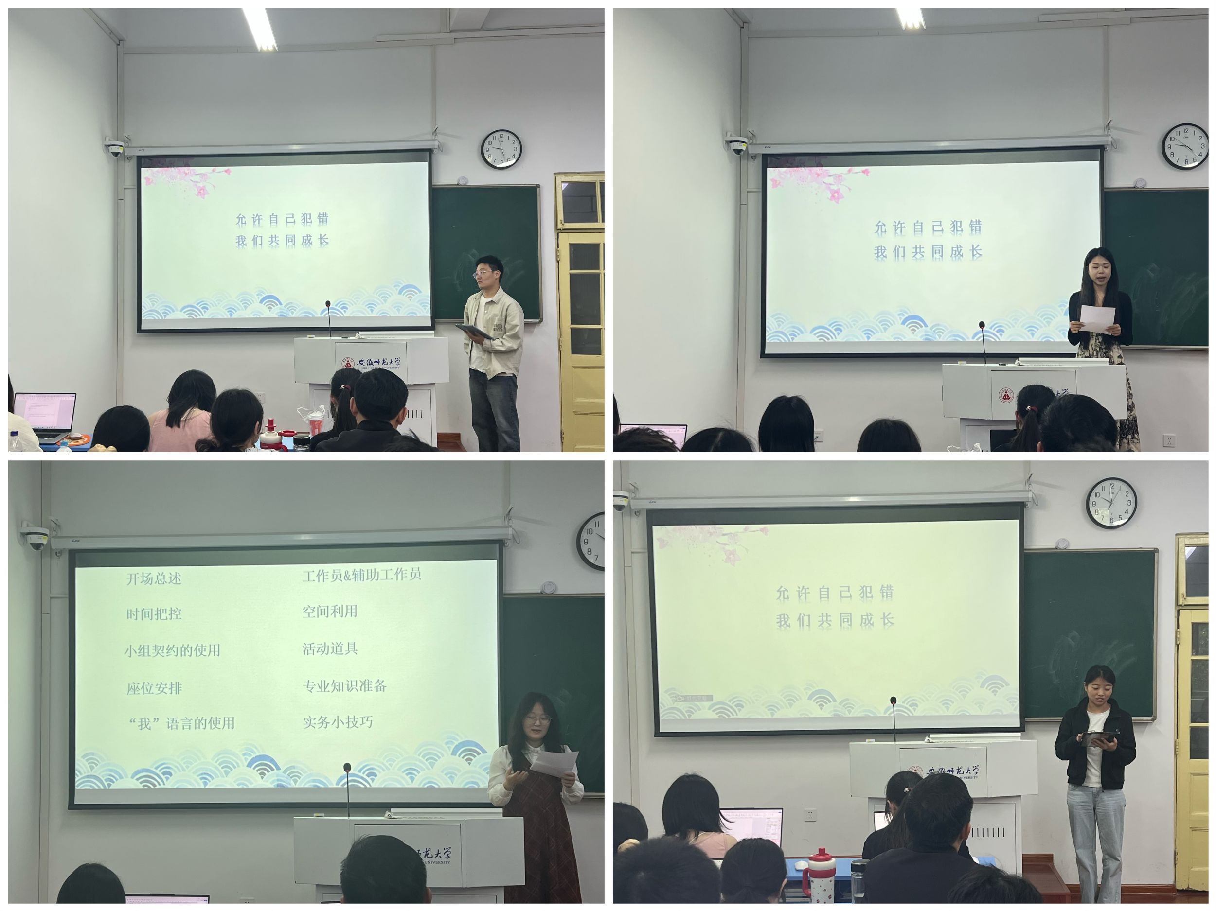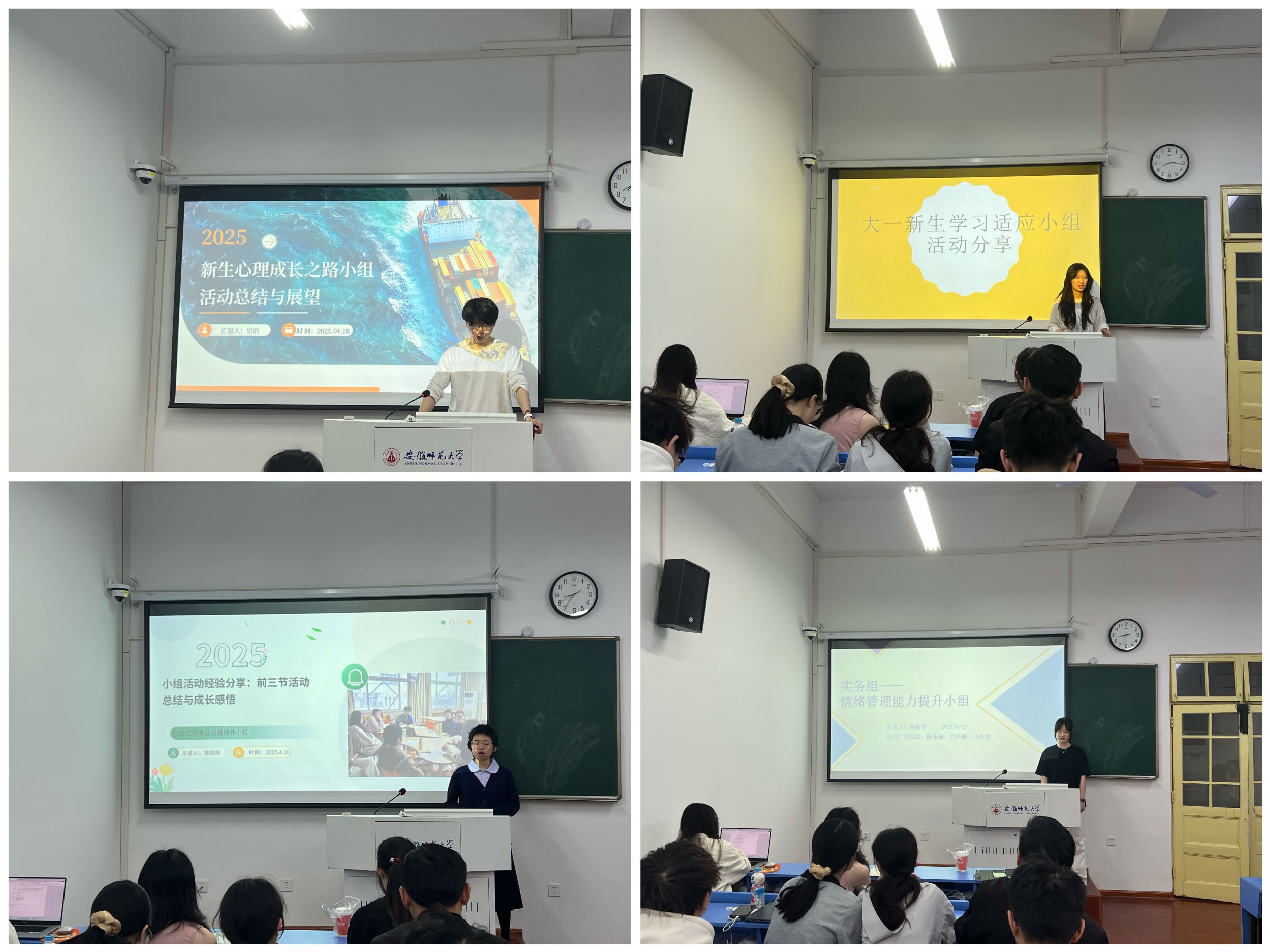 根据前期开展的工作情况,各小组代表依次汇报活动开展情况。其中,大学新生适应小组聚焦活动过程中小组工作者的情绪反应,讲述小组工作者在前期准备、活动过程中的心理感受,指出社工伴学是双向促进。生活适应帮扶小组主题聚焦为人际适应方面,小组组织破冰活动和兴趣社团对接,帮助新生拓展人际网络。多名新生表示“找到了志同道合的朋友”。心理成长小组则重点汇报了活动多样的开展方式,例如“仙人指路”、“薪火相传”等游戏的穿插,极大促进了活动的趣味性、可行性。
