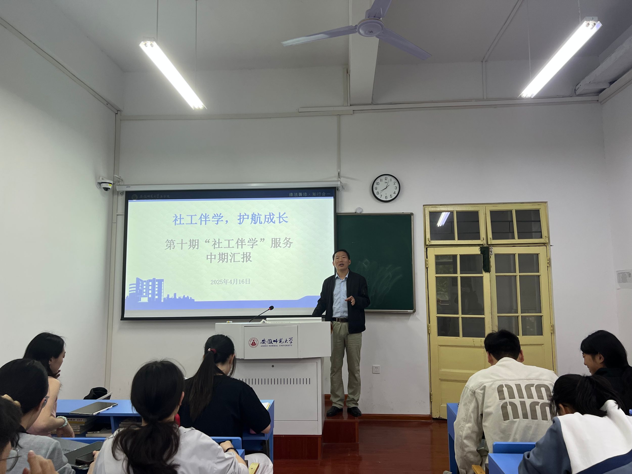 为进一步检验“社工伴学”护航服务的阶段性成果,推动服务质量的持续提升,2025年4月16日上午,社会工作专业在赭山校区教学楼1210教室召开了第十期“社工伴学”服务开展中期汇报会。22级社会工作专业班主任王杰、四名社会工作专业研究生督导助手以及全体参与服务的三年级员工参加会议。